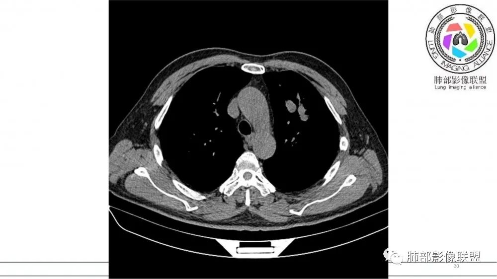 70岁男,吸烟史,左肺上叶不规则肿块,轻度强化,前段支气管增厚,周围可见阻塞性小花小草,考虑鳞癌