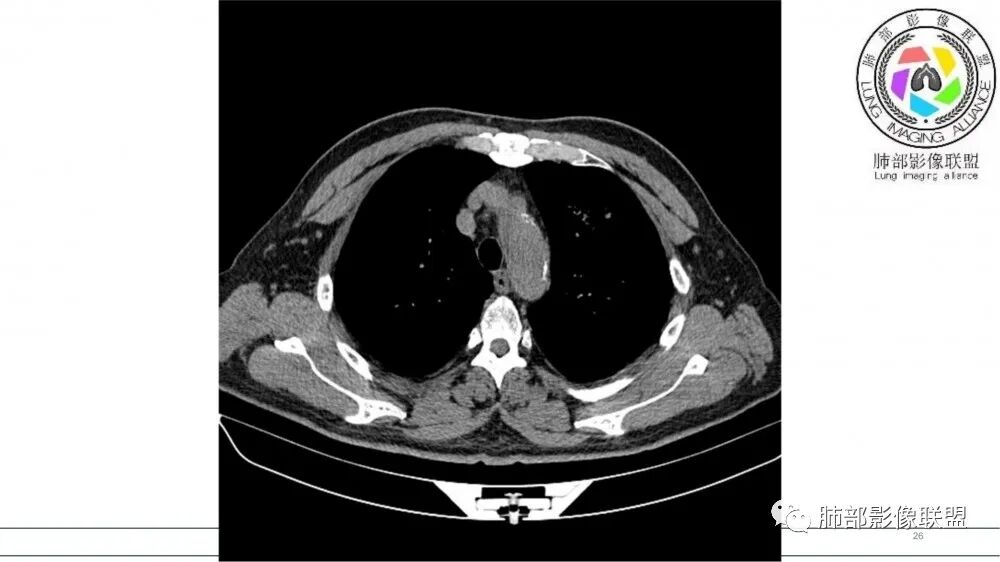 小花小草,铸型粘液拴,左上叶支气管壁增厚,腔内可见软组织结节,粘液无强化,伴随血管粗细不均,老年,吸烟,定性恶性,磷癌