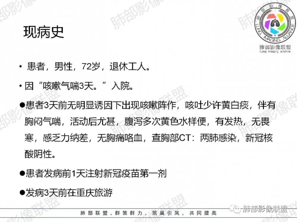 旅游史,这个患者去大城市住的空调房还是到乡下农家院酒店过的农村生活呢,没说清楚。病灶整体有非叶段分布特点+小叶内间质增厚+病灶比较干+肺容积稍缩小,鹦鹉热>军团菌。小叶内间质增厚明显,肺克可能性就不大了!