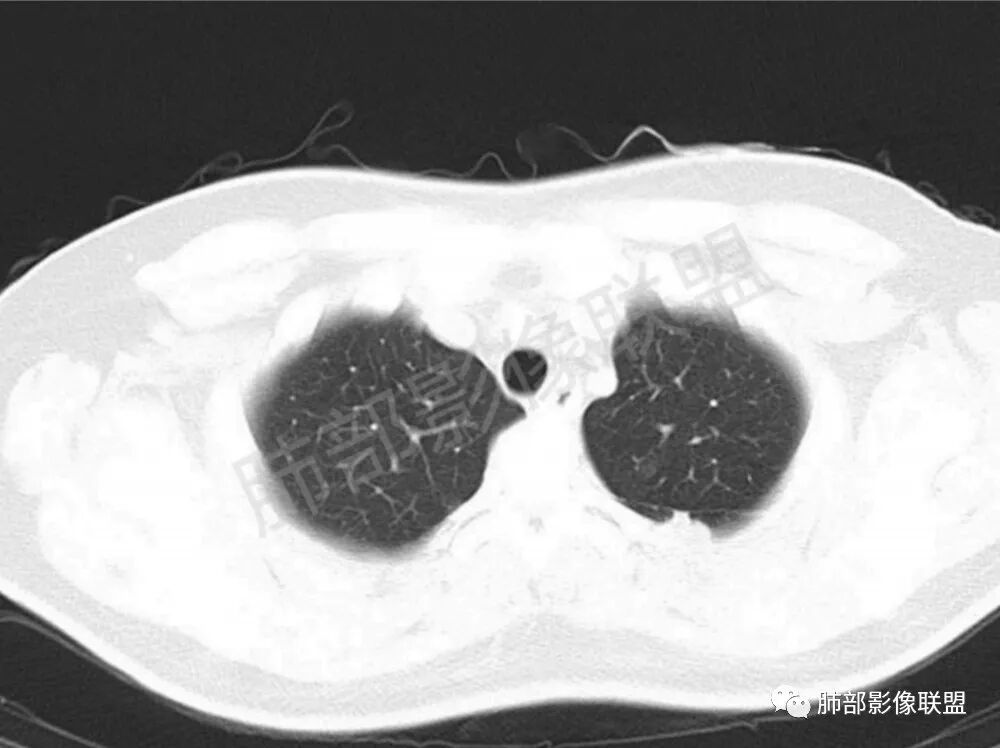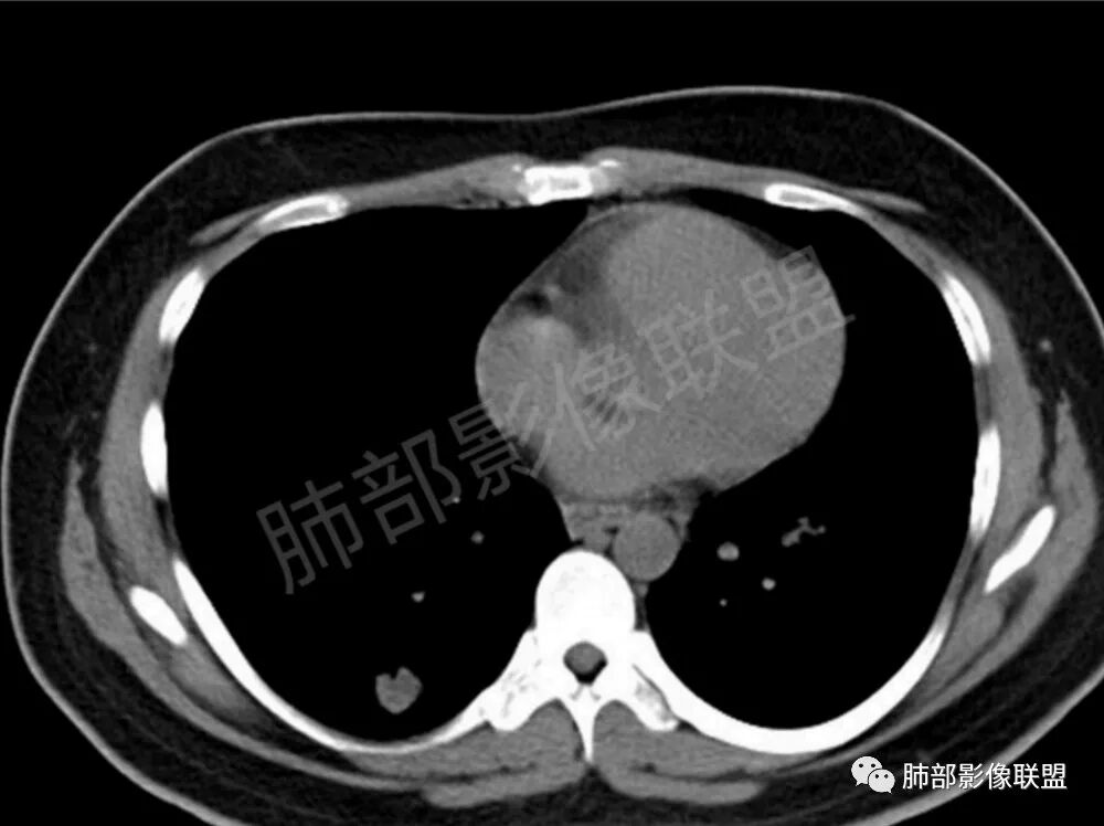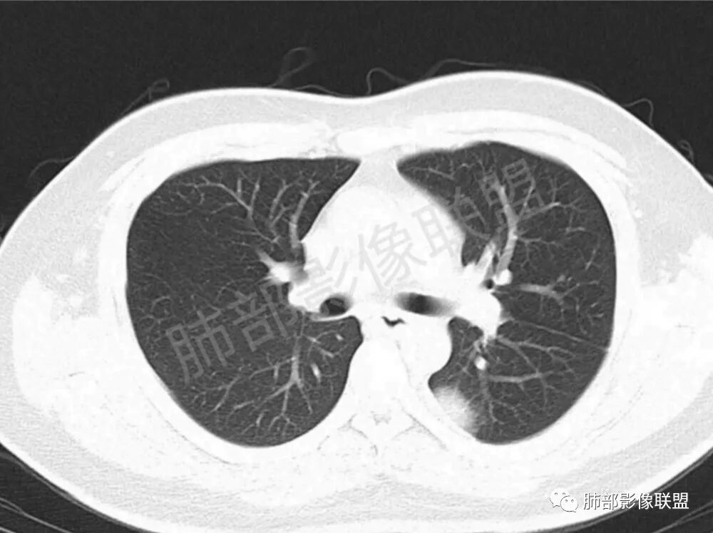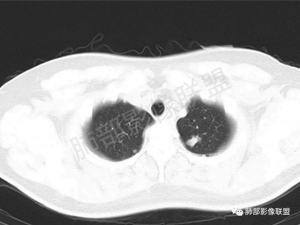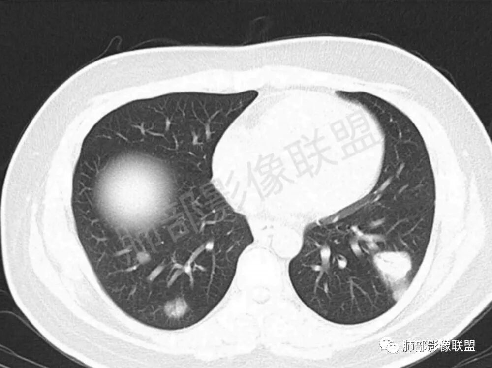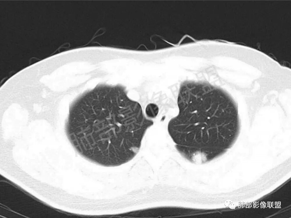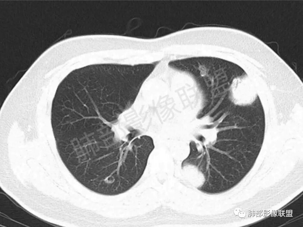 影像学缺乏特征性,以支气管血管周围、胸膜下及双肺下叶周边多发结节影最多见,结节易坏死形成空洞,伴有游走性和多变性的特征,结节周围可有磨玻璃样晕征,有时也可见单发结节影、薄壁的囊状阴影或弥漫性浸润影。肺门、纵隔淋巴结肿大少见, 可见胸腔积液和气胸。