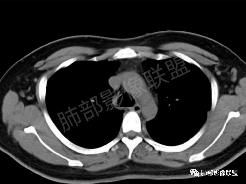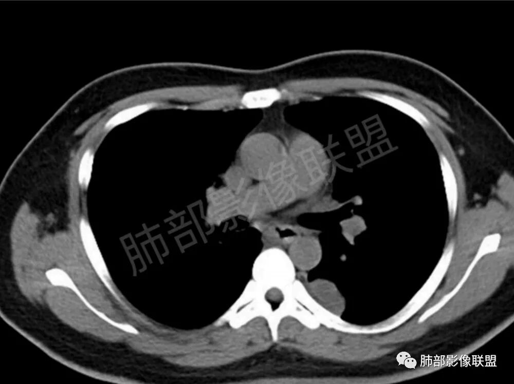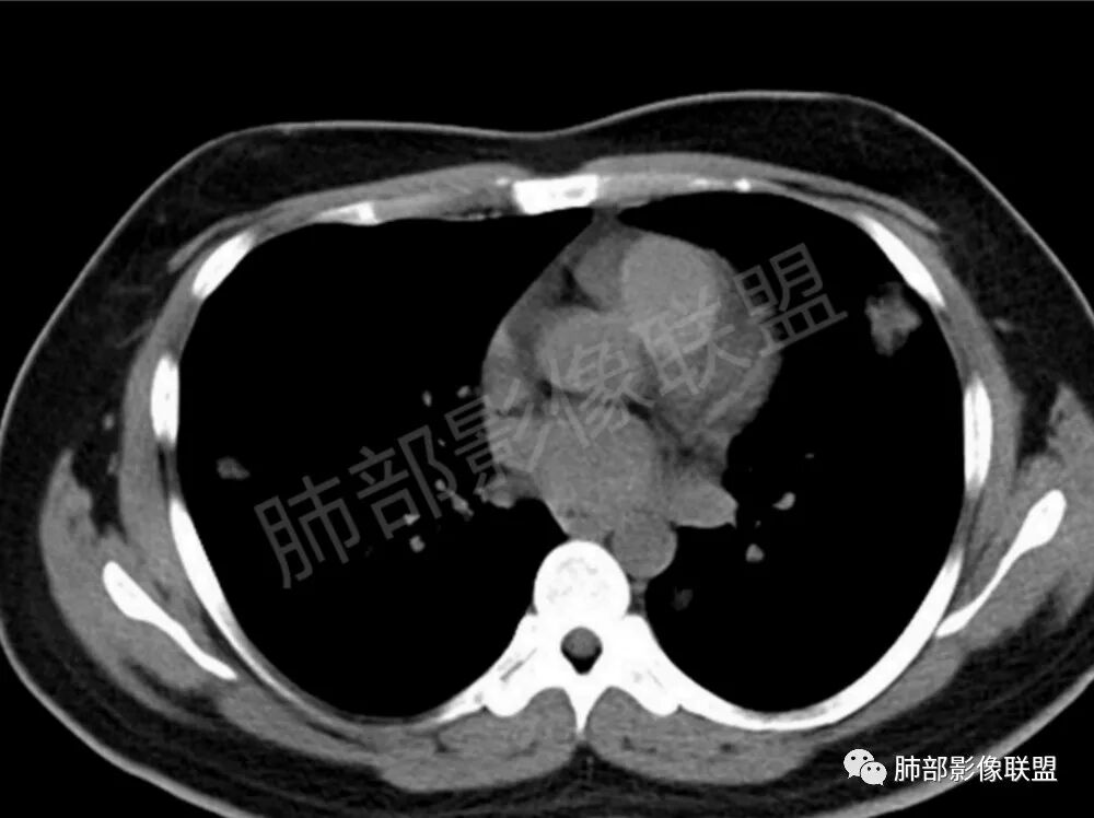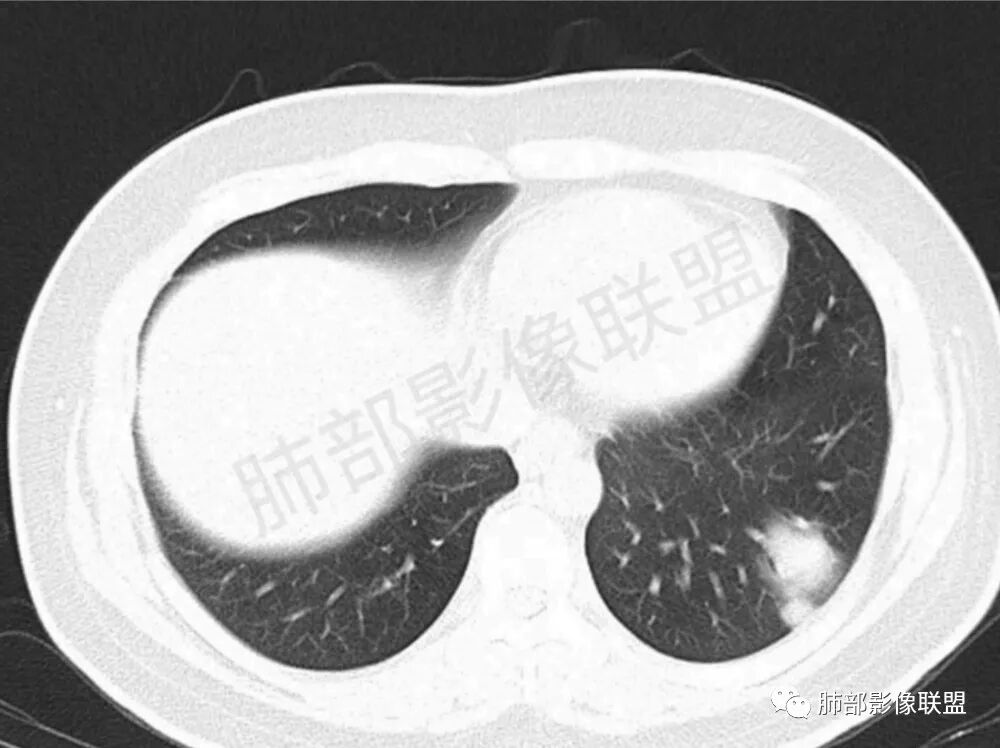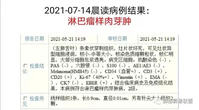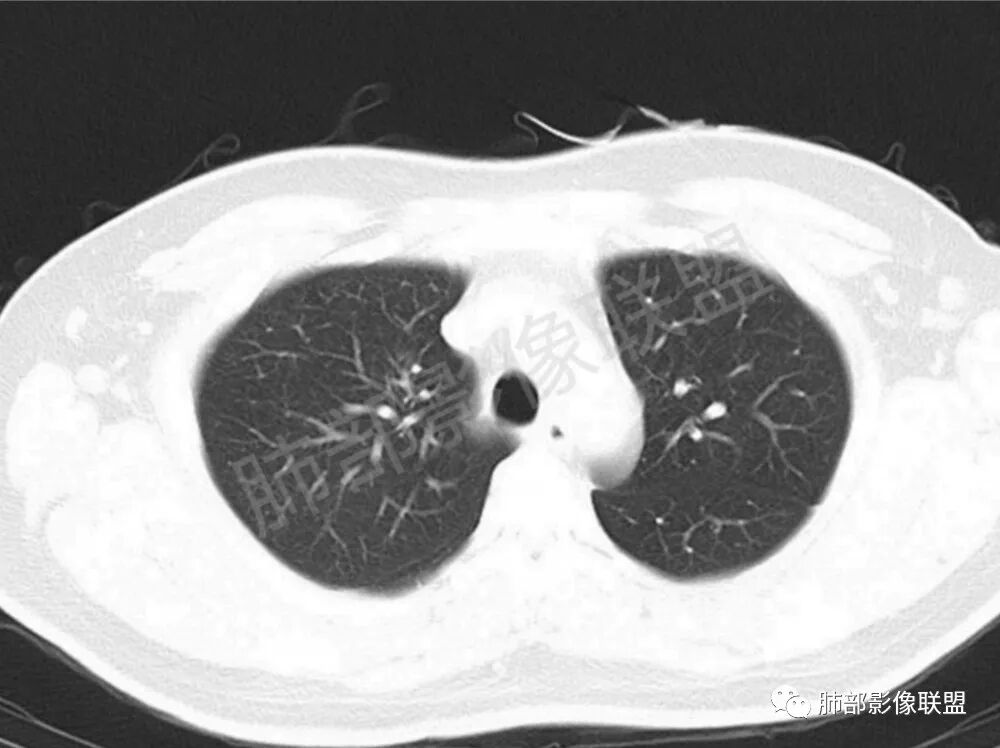 男,22,半年前咳嗽伴少痰,查HIV阳性,痰查TB阳性,既往有肺部斑片影伴空洞、纵隔淋巴结肿大、脾大。SCC、CA50、CA199、FER增高,此次胸部CT:两肺多发结节影,部分沿血管束分布,部分贴胸膜下,大小不一,密度不一,部分较散、边缘模糊,部分较实、圆钝、周围模糊晕,部分结节有支气管进入穿行自然,部分结节有血管分支自如通过。考虑HI∨相关淋巴增殖类病变,淋巴瘤?LYG?鉴别PC、TB。