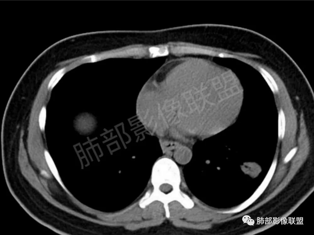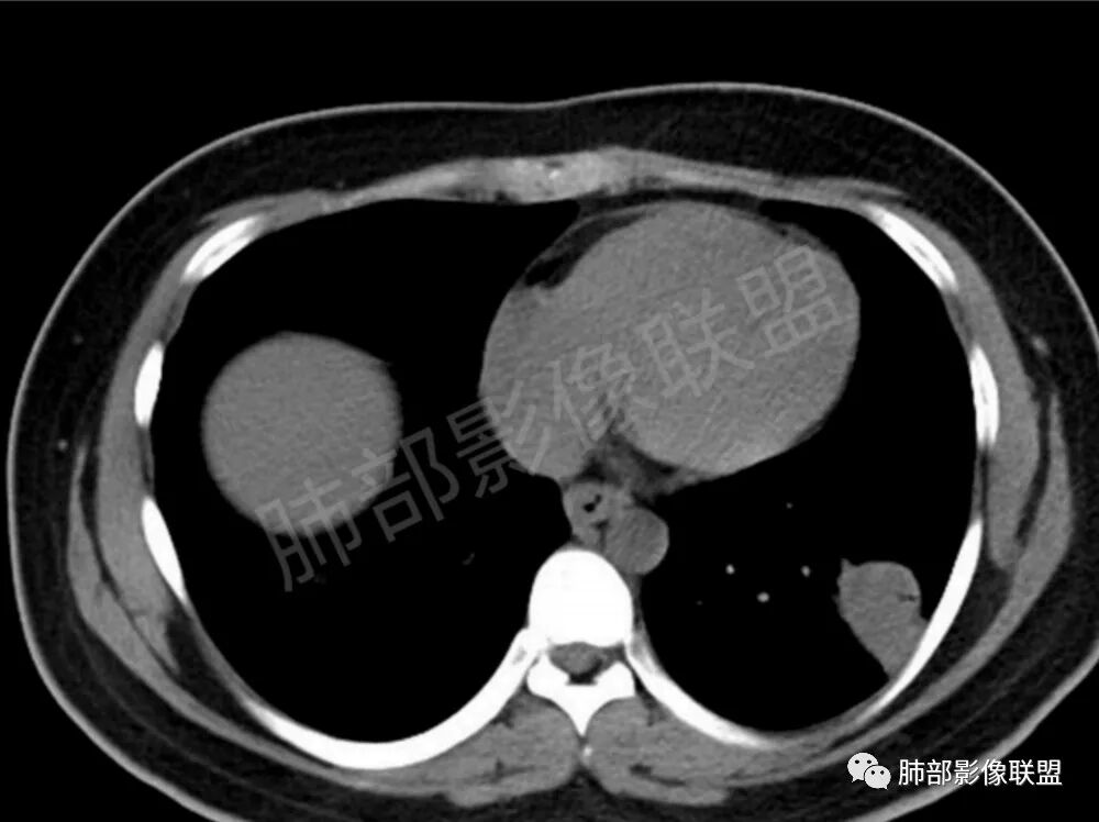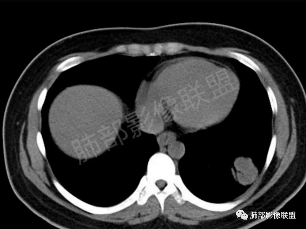 2.类圆形,部分与胸膜相连,糊墙