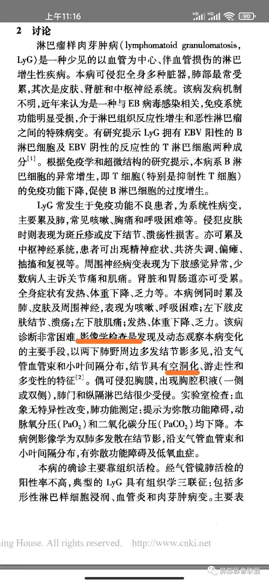 3.肺转移性肿瘤:肺转移性肿瘤也常可表现为肺部多发性结节。转移性肿瘤的结节常为圆形,边缘清晰、光滑,密度均匀无空洞,一般无大片浸润影,而LYG常表现为伴有空洞的结节形成,可见到肺大片浸润性阴影。