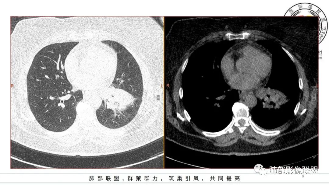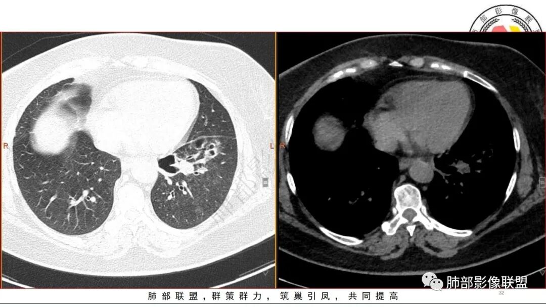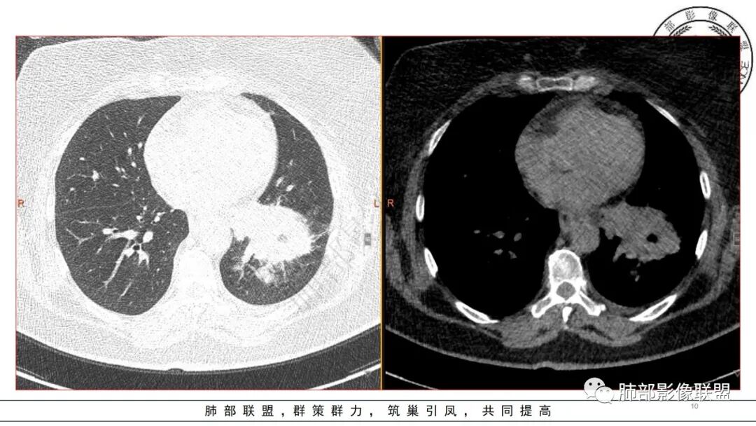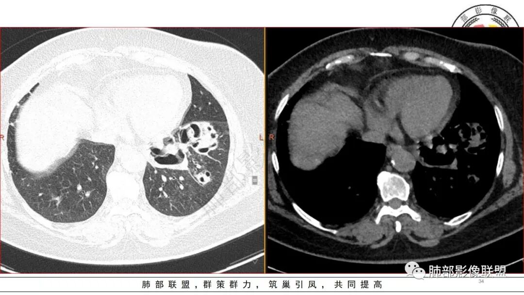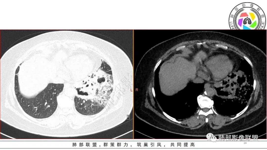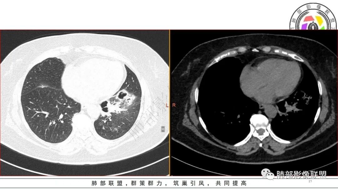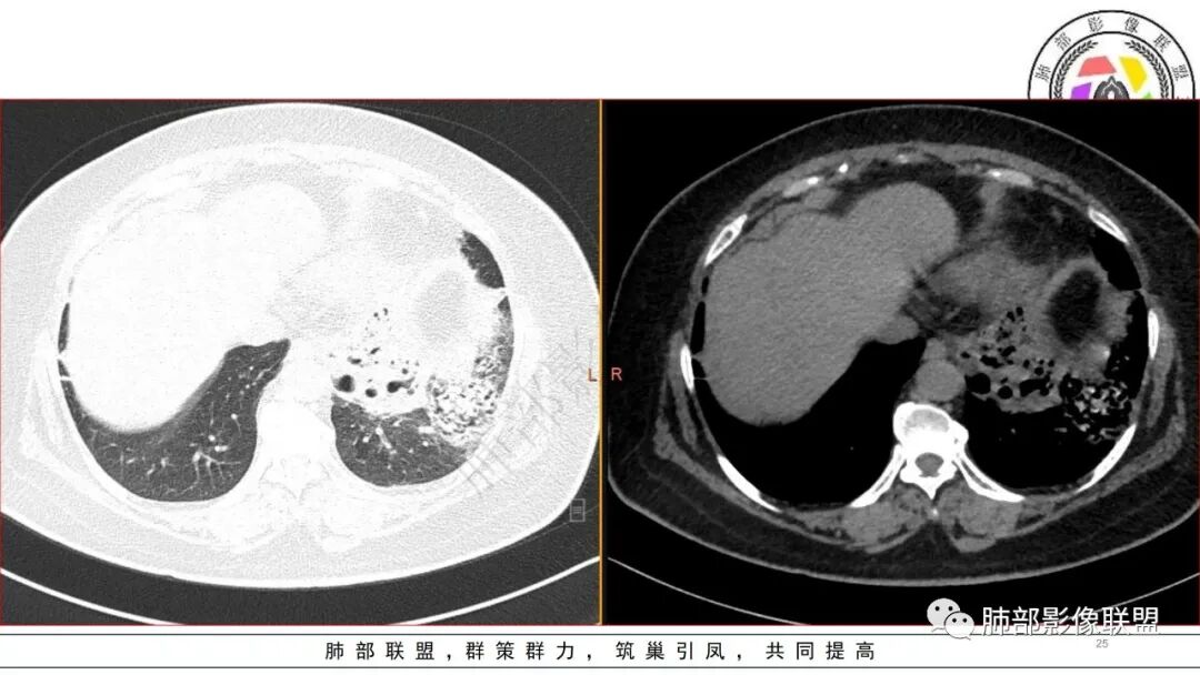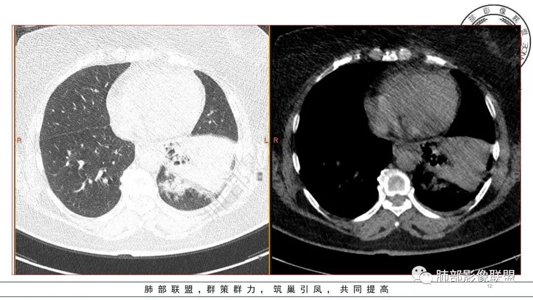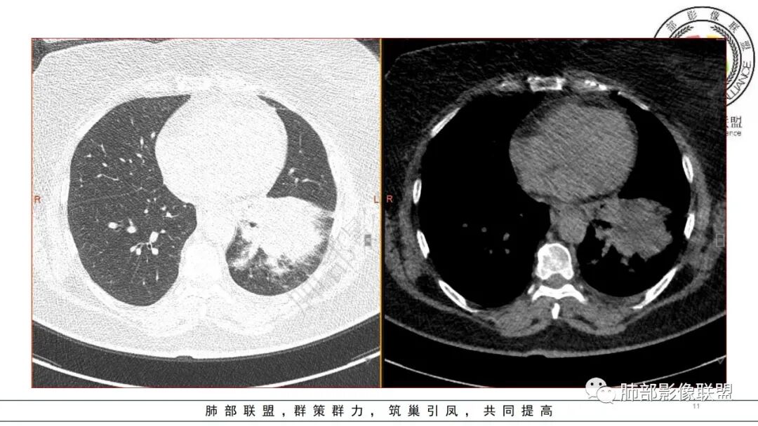 2.左肺下叶大范围实性密度影,散乱,边界不清,可见液化空洞,病变肺体积轻度增大。支气管相关(相应支气管闭塞)。
