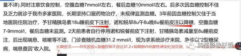 4.肺克:糖尿病基础,左下肺细菌性炎,肺克可能,但是肺克痰液粘稠,不易排出,肺部脓肿常表现“单腔-多囊-无壁-不液化”,与该患者不太吻合,待排查;