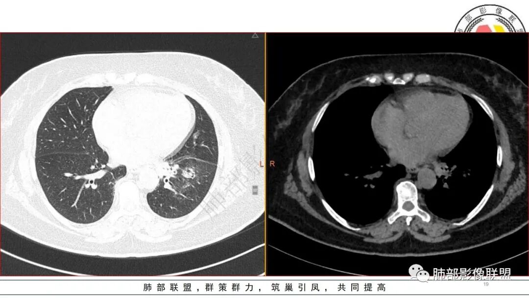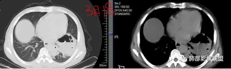 糖尿病基础,左下肺感染性病变,进展快,先是左肺大片实变,短时间复查出现空洞,治疗两周周边有吸收好转,空洞壁变薄。金毛结克,我倾向金葡菌。鉴别肺克。