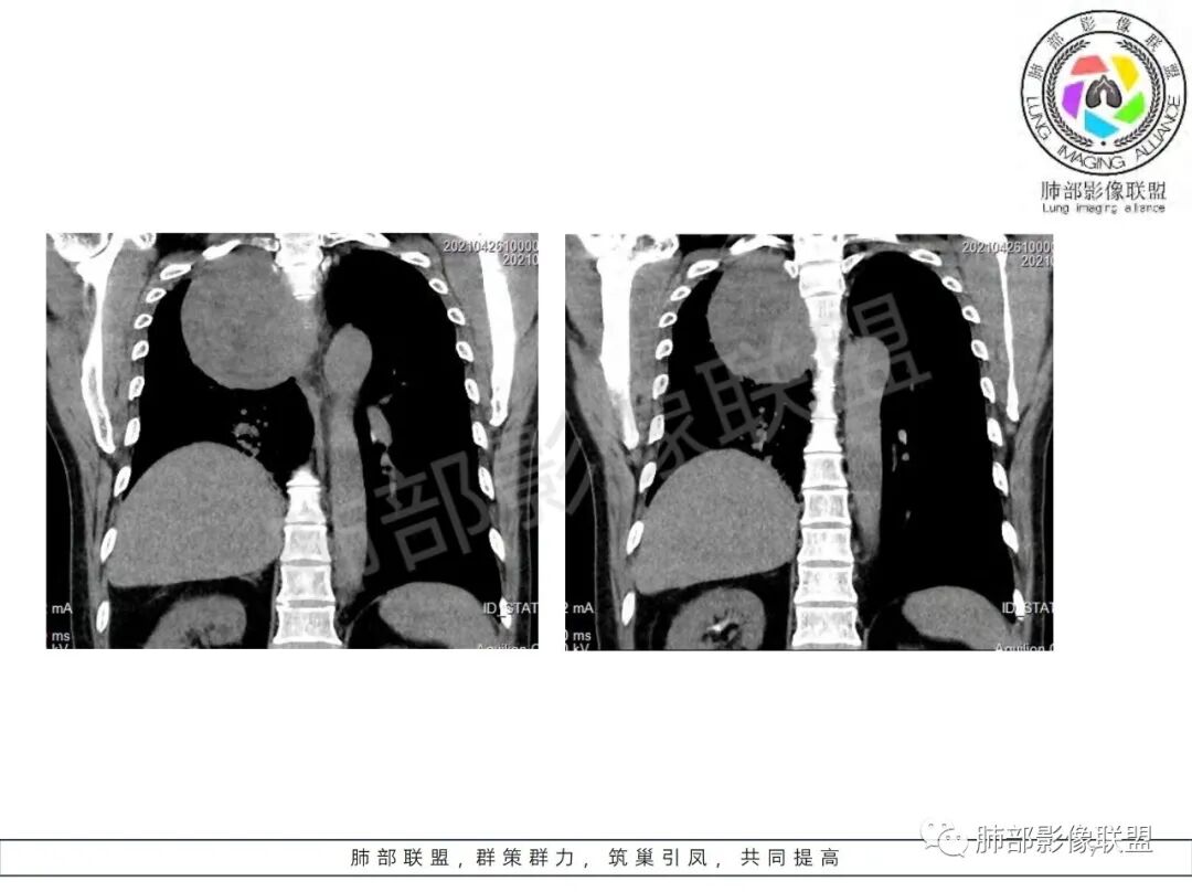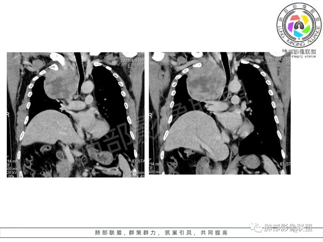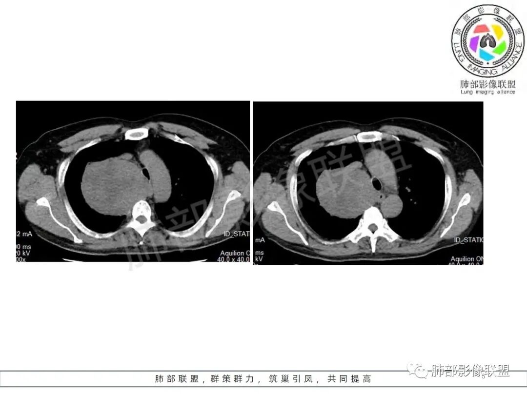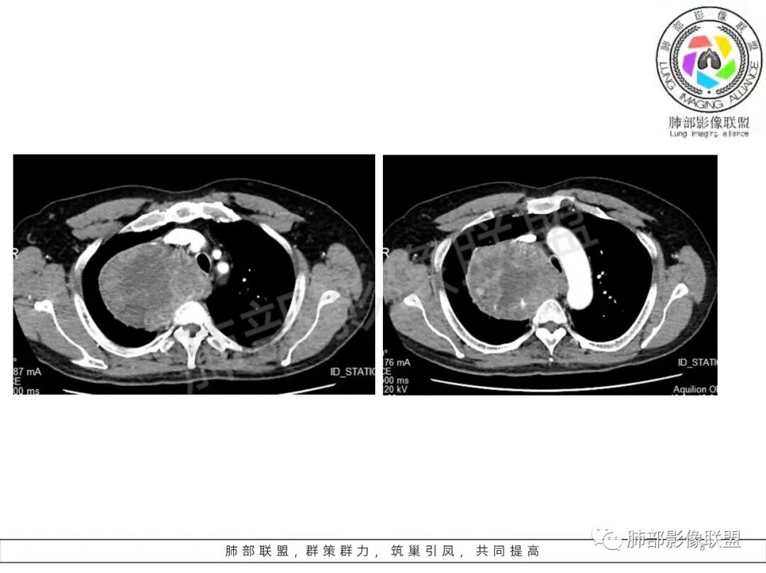 来源于中纵纵隔?大肿块,密度不均,有囊变坏死,增强不均匀明显强化。考虑恶性肿瘤,病理提示间叶来源,考虑淋巴肉瘤,网状细胞肉瘤?