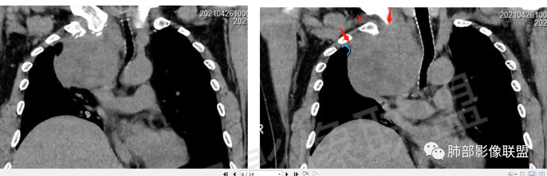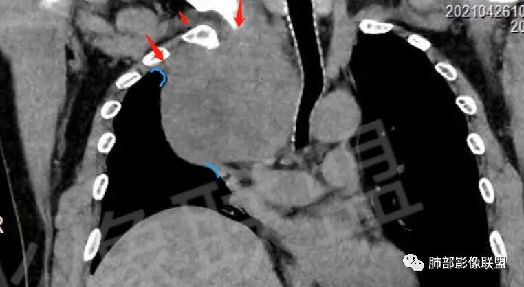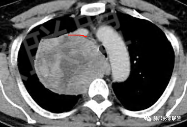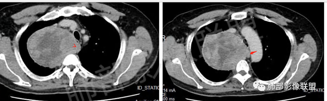 纵隔:上腔静脉后方主要是膈神经,神经源性可以;后方局部与食道关系密切,食道来源肿瘤也可能,一般食道来源向前推移,这里推移方向不支持;气管受压,壁完整,软骨连续,气管单纯受压没有破坏,后方向内推移,不支持气管来源