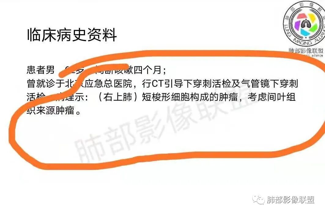 男,69岁,间断咳嗽4个月,右上肺体积缩小,可见巨大软组织占位,胸膜掀起,考虑来源于肺外,平扫密度不均匀,增强扫描明显不均匀强化,内部可见粗大血管及坏死区,周围组织受压移位。局部与食管分界不清,穿刺提示短梭形细胞,来源于间叶组织可能,综合考虑为神经鞘瘤>SFT