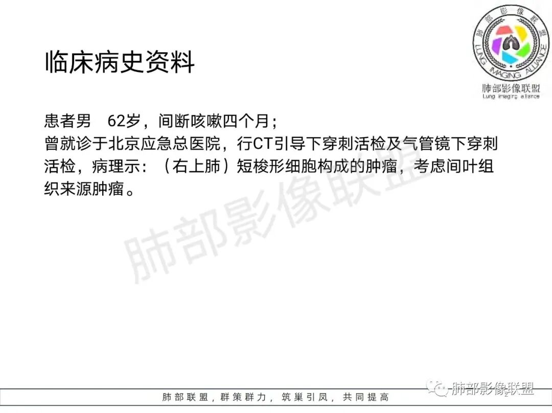 晨读病例,62岁男性,间断咳嗽四个月,影像表现右侧胸腔内见巨大肿块影,边界清晰,其内密度不均,增强扫描病灶呈不均匀性强化,病灶内见坏死及强化的小血管影,考虑恶性病变,肉瘤类病变,纤维肉瘤,滑膜肉瘤,癌肉瘤,恶性纤维组织细胞瘤。