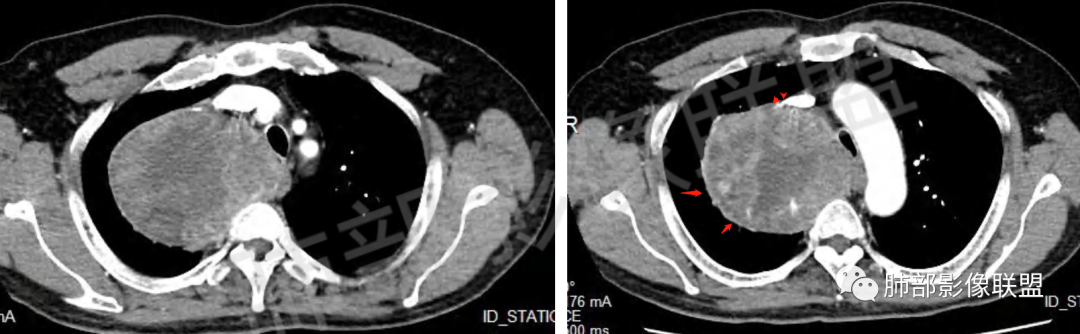 定位肺外,来源于胸膜的SFT(蛇纹状血管)、鞘瘤(不均匀强化,囊变坏死多)、间质瘤(部分层面与食管分界不清)。
