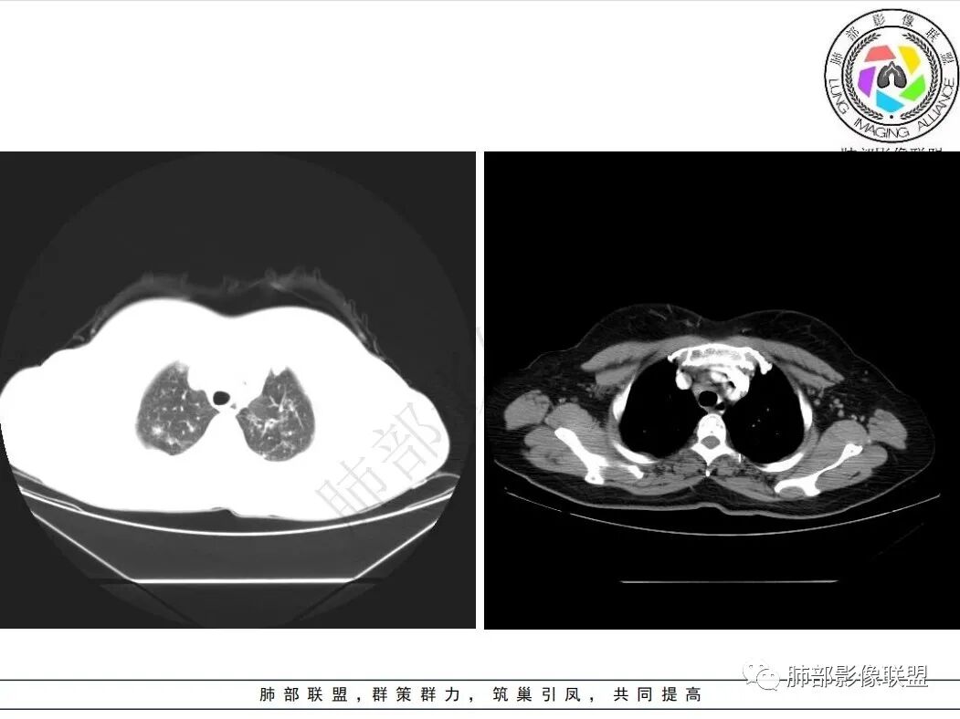 中老年女性,中轴间质增厚,双肺多发结节,沿淋巴道分布,考虑结节病,鉴别血管炎
