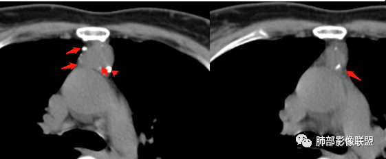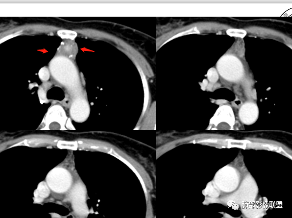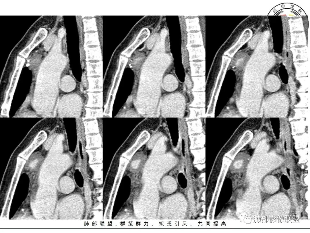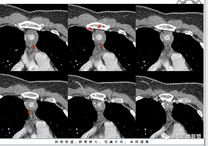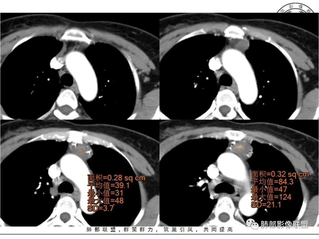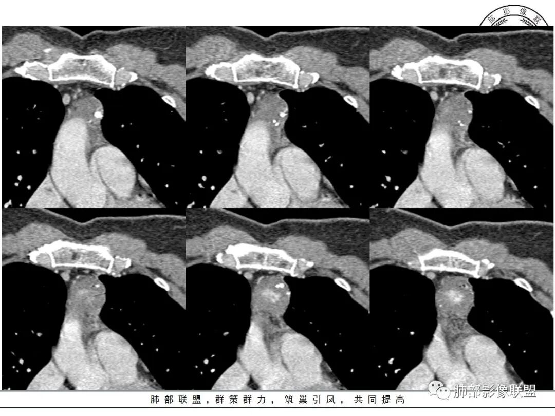 红星:女性病人48岁,前上纵隔,类圆形的实性病变,平扫密度比较均匀,周围卷见点状的钙化灶,增强扫描明显的强化, 多时相扫描中心可见跟大血管强化幅度一致的结节灶。常规胸腺瘤?鉴别血管瘤?