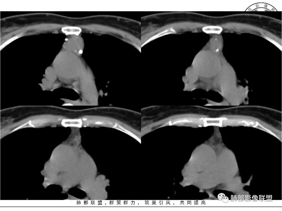 不吝慷慨:前上纵隔,边缘钙化,中央强化非常明显,形态不考虑胸内甲状腺,胸腺瘤强化又太明显,考虑嗜铬肿瘤或脉管类肿瘤。