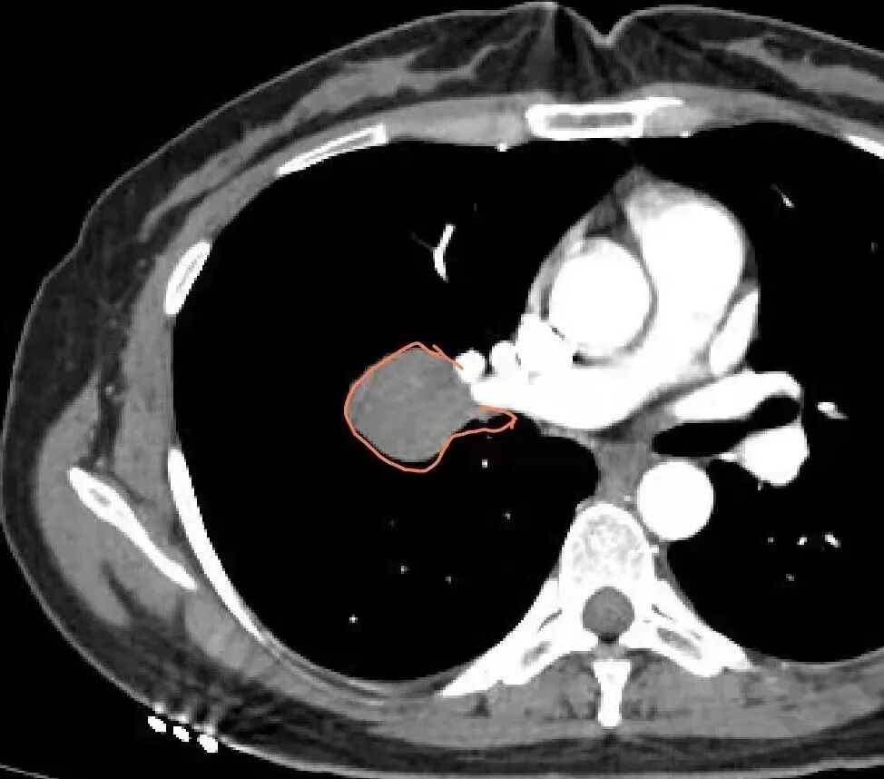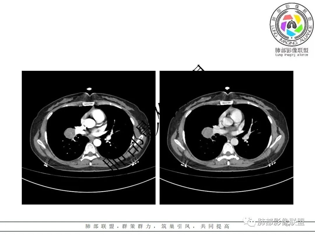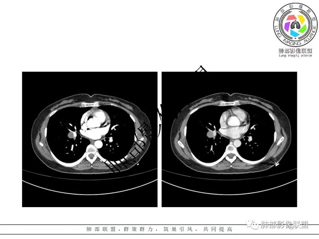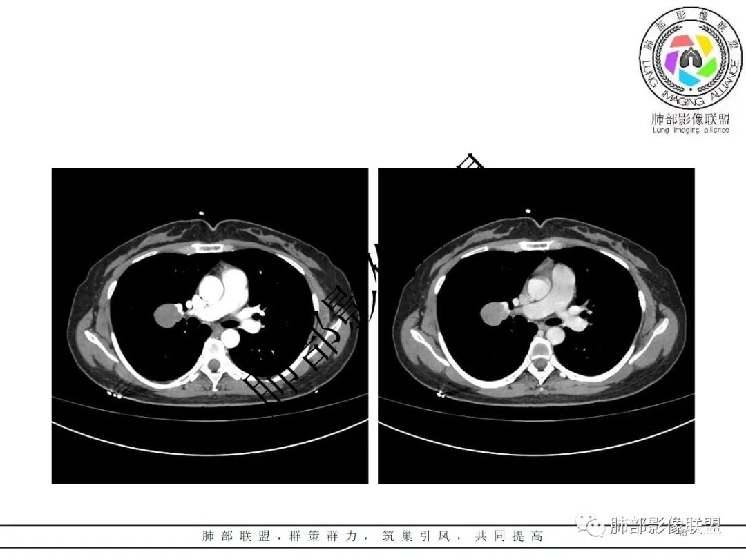 3.病灶密度均匀,未见液化坏死、钙化及脂肪低密度。轻度强化,可见纤细血管影蜿蜒穿行。右肺动脉推移变形,未见侵入或充盈缺损。