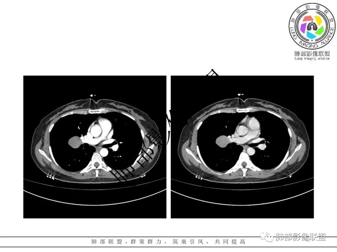 鉴别诊断:PSP、SFT类癌,肿块主要与血管关系密切,与气管关系不大,故类癌可能性小,肿块渐进性均匀强化,可见血管贴边征、肺动脉为主征,中年女性患者,首先考虑PSP,肿块与叶间裂关系比较密切,不能除外SFT,但与血管关系更为密切,SFT往后排一下。