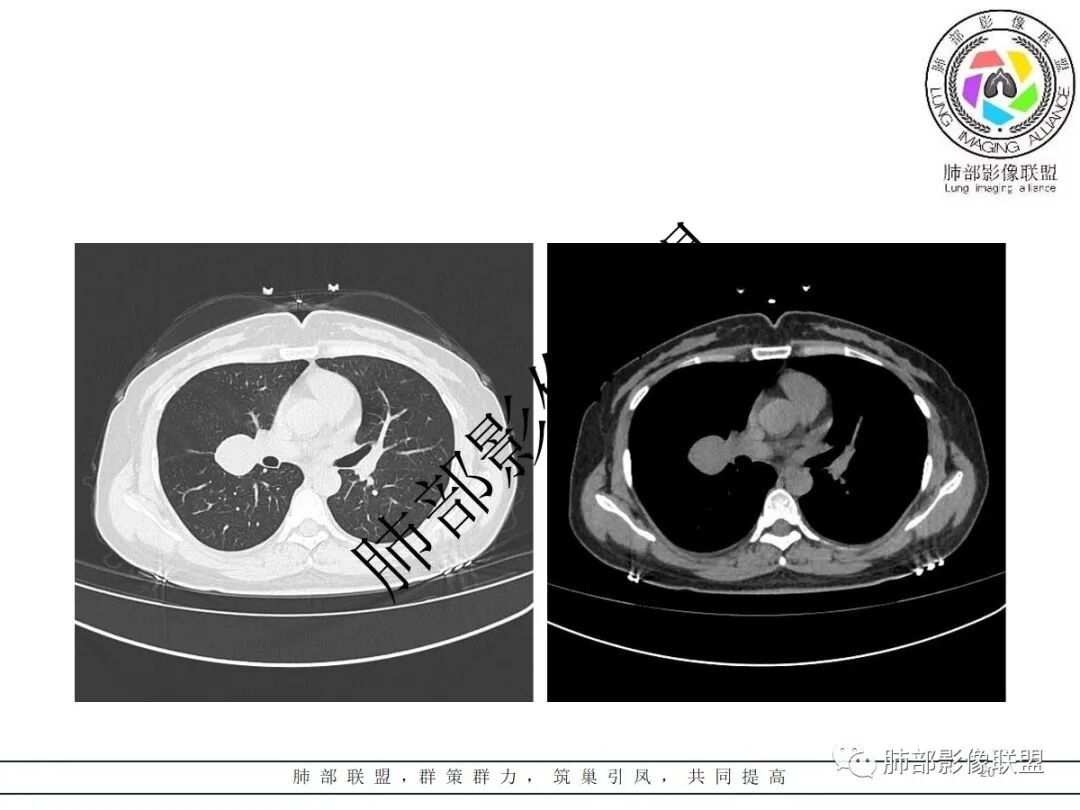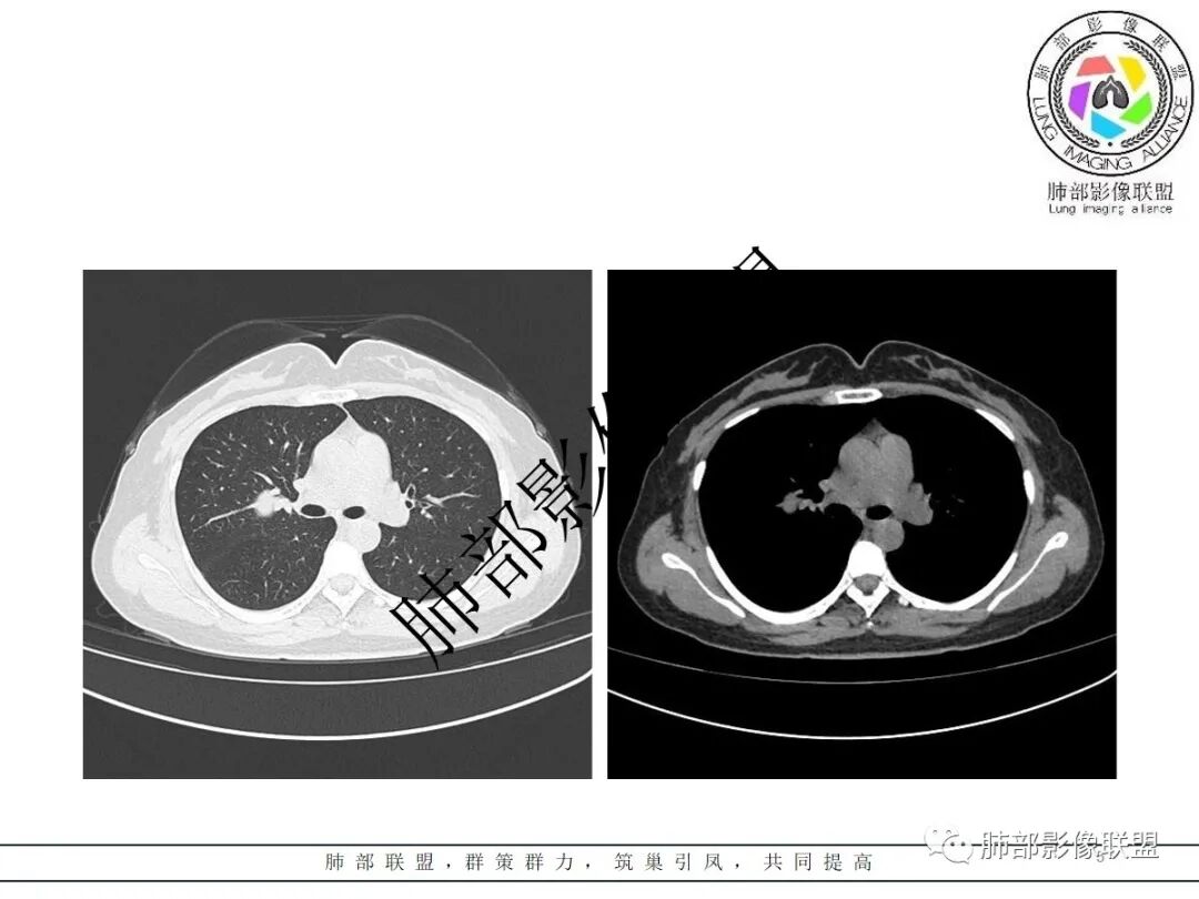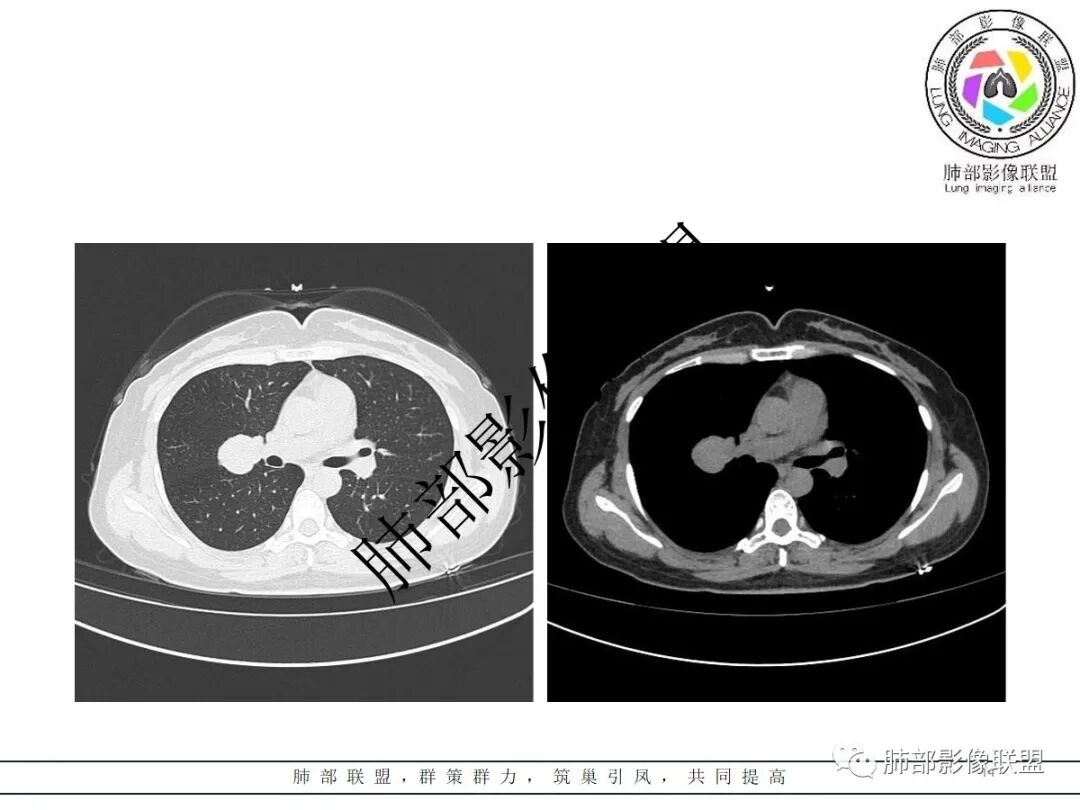1、如果与支气管无关,支气管只是推压,没有支气管堵塞、进入,我们就考虑非支气管性病变。非支气管性病变有哪几类的?第一类,就是PSP。第二类是神经鞘瘤。第三类是淋巴道来源的,巨淋。然后就是错构瘤,还有畸胎瘤、支气管管囊肿。就这几类,然后我们再进一步鉴别;再分强化还是不强化。如果不强化,首先考虑错构瘤,还有畸胎瘤、支气管囊肿。他们之间的差异性还有的,畸胎瘤是不均匀的、实性的,囊肿完全囊性的。这类病变我们一般能定个方向,就是大多数是良性的,当然前提是孤立的、一个的,不是很大个的。