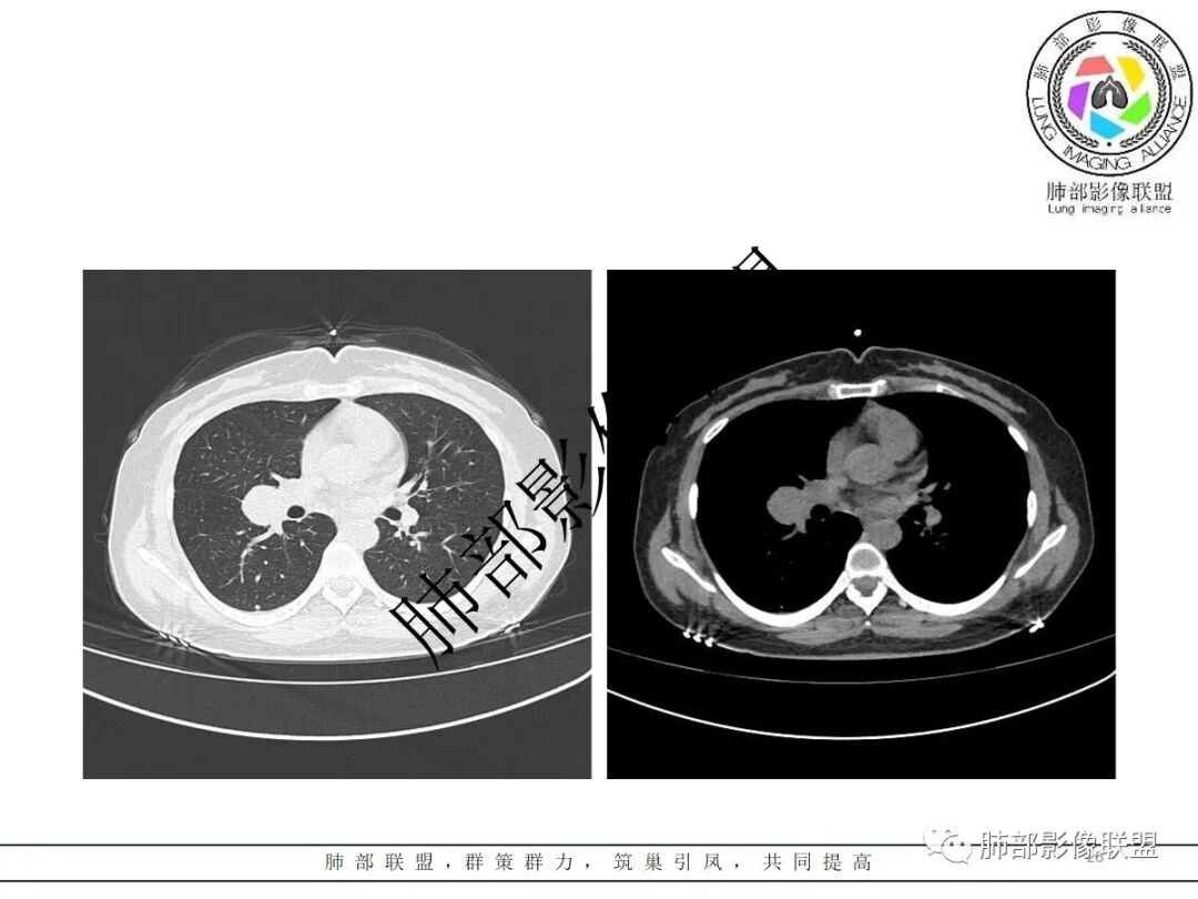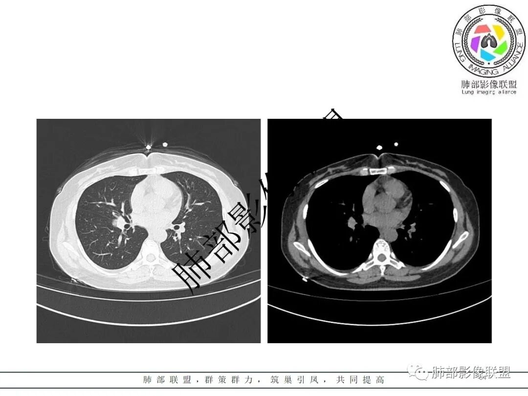 就是说如果常规分析,肺门区一个肿块,边缘很光滑,我们发现和支气管一点关系都没有,我们心里就很踏实了,不担心了。如果和支气管有关系,就要紧张了,因为要鉴别癌和炎性病变了。这个时候也可以建议做支气管镜。问题是我们现在拿来读片的病例,往往忽略了病灶和支气管的关系,所以我建议下次读肺门区孤立性结节时,大家首先交代支气管和病灶的关系,如果支气管和它无关,那我们大方向就定了,然后再去细分,再去鉴别他们,我们都不用太担心。