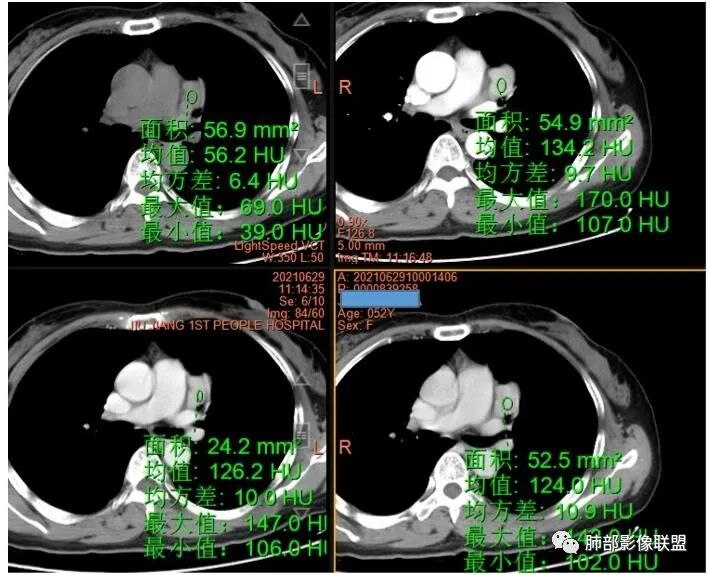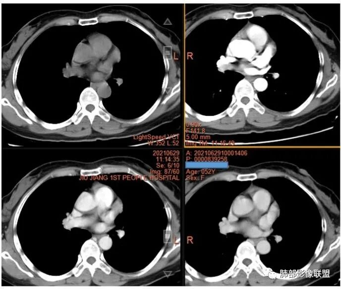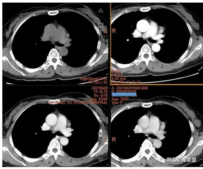 女,52。胸部CT:主动脉旁实性结节,边界清楚,两个/分隔?边缘光滑膨隆。平扫密度较均匀,增强扫描明显强化,强化均匀。富血供病灶,周围界清,考虑良性病灶,CD、副节瘤、血管瘤、胸腺瘤、异位甲状腺等。