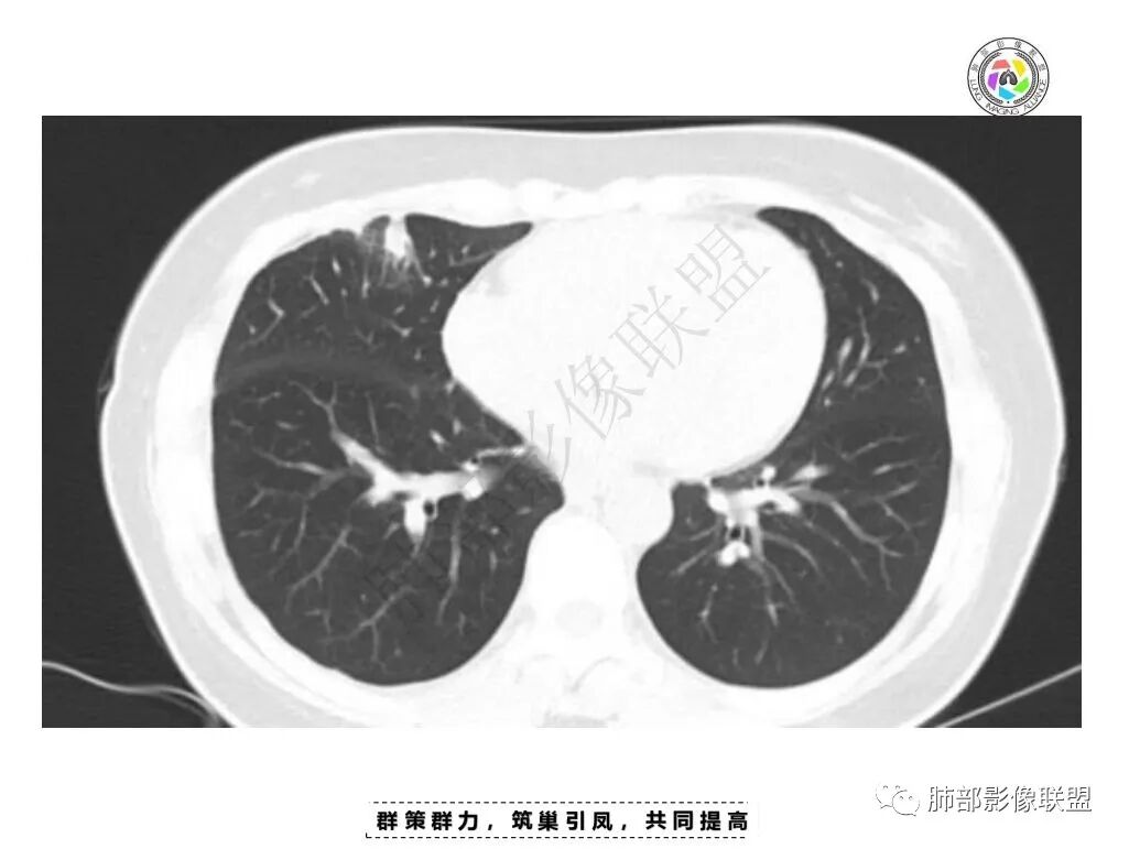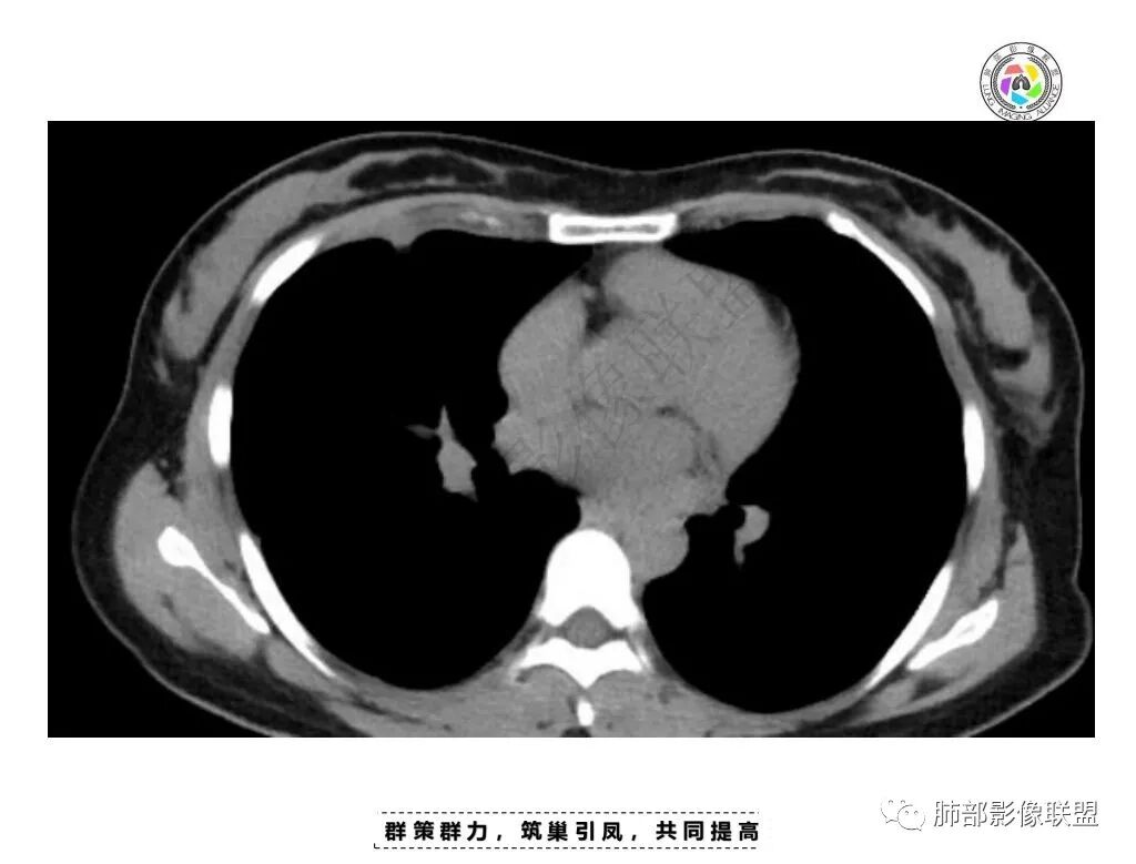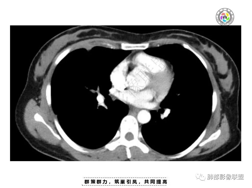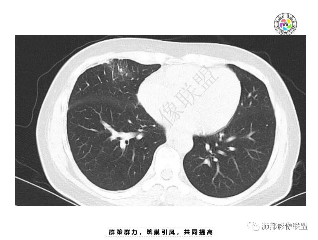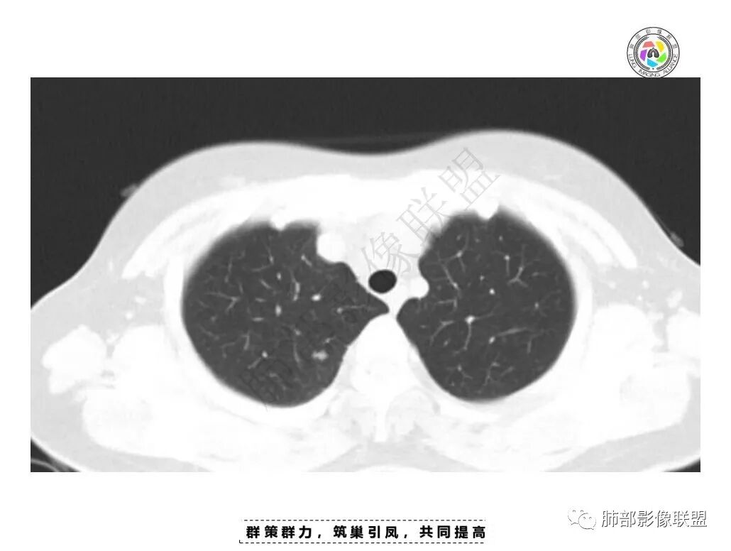 女,34,胸痛1年余。胸部CT:两肺上叶小结节。右肺胸膜下两个结节,宽基底与胸膜相贴,胸膜尾;右前胸膜下结节影,胸膜局部增厚、糊墙,胸膜下脂肪间隙模糊,部分层面结节灶边缘毛糙、支气管血管进入,结节增强后内有片状坏死区,一月后复查有增大。慢性病史,多部位,多灶,多形性病变,肺内、胸膜都有病变,常规考虑结核等慢性特殊感染,鉴别淋巴瘤。
