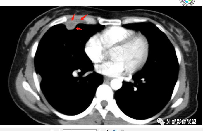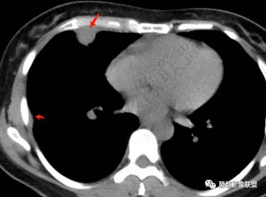 胸膜多个结节,附近胸壁脂肪间隙密度增高,提示有胸壁蔓延或侵犯。