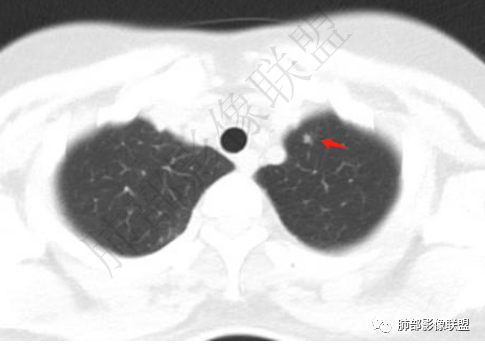 肺内多发小斑片状高密度影,密度不均匀,边缘稍平直