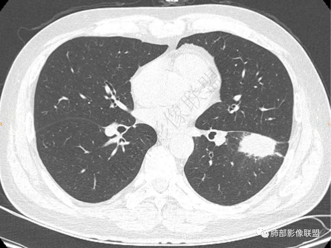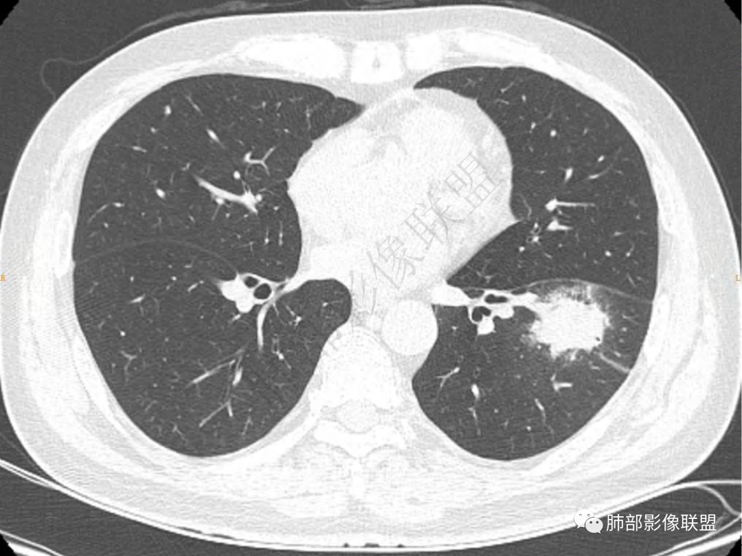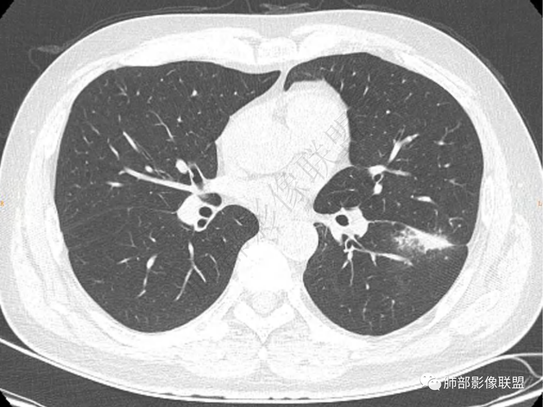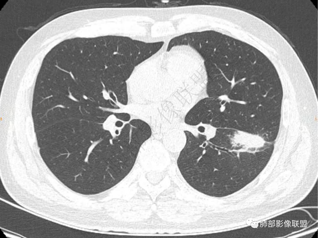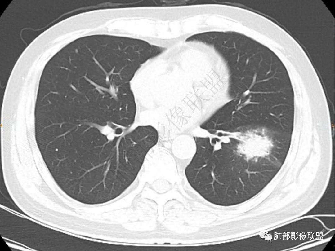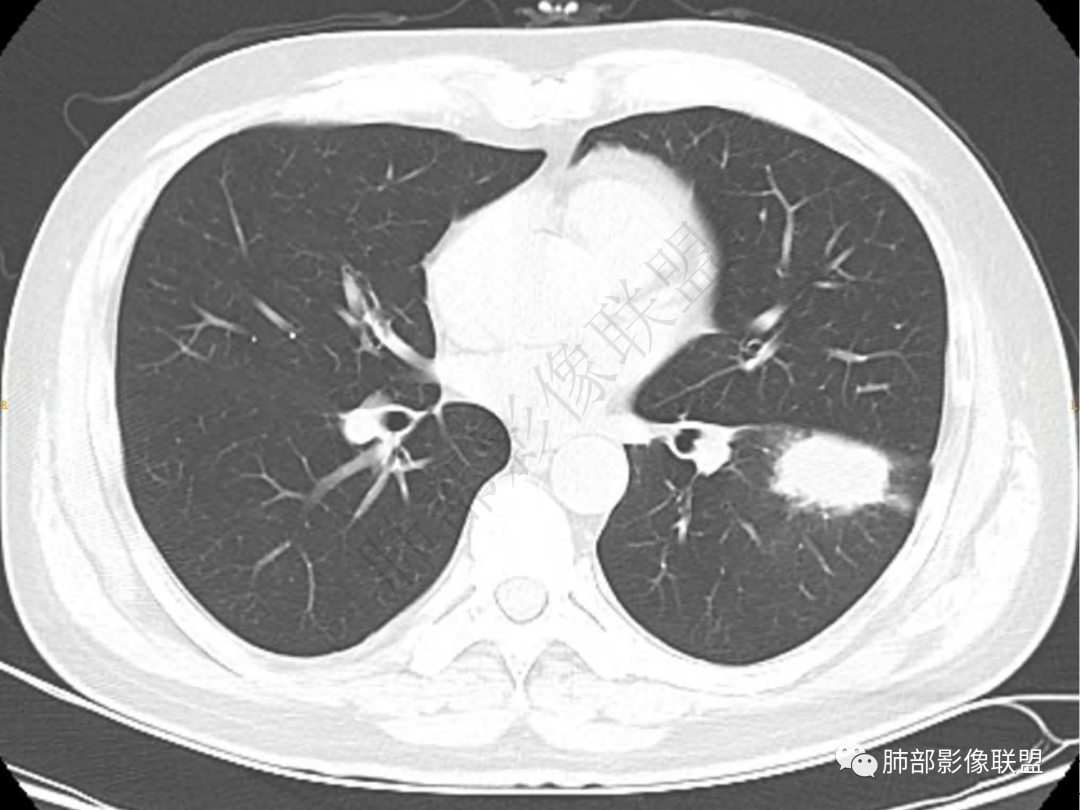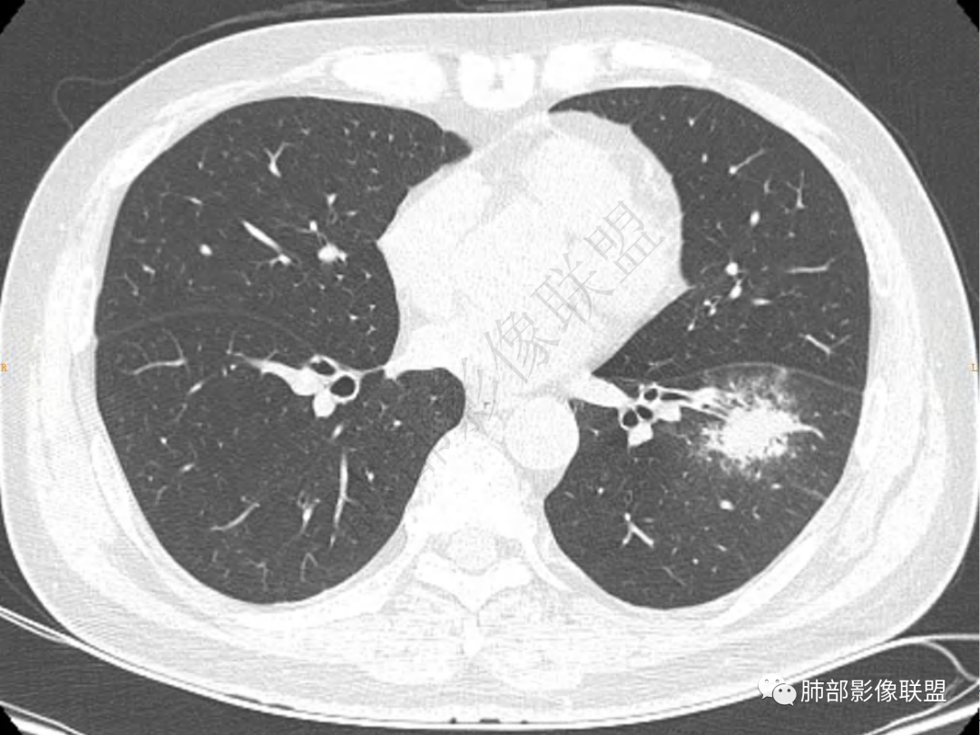 中年男性患者,咳嗽、咳痰20天,咳血2周,炎性指标正常,胸部CT:左肺下叶前基底段结节影,边界清楚,部分平直,部分彭隆,周边见界限清楚的磨玻璃影,分叶不明显,毛刺细软,强化均匀,周围见多发斑片状磨玻璃样密度影,首先考虑炎性病变