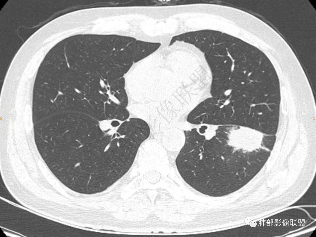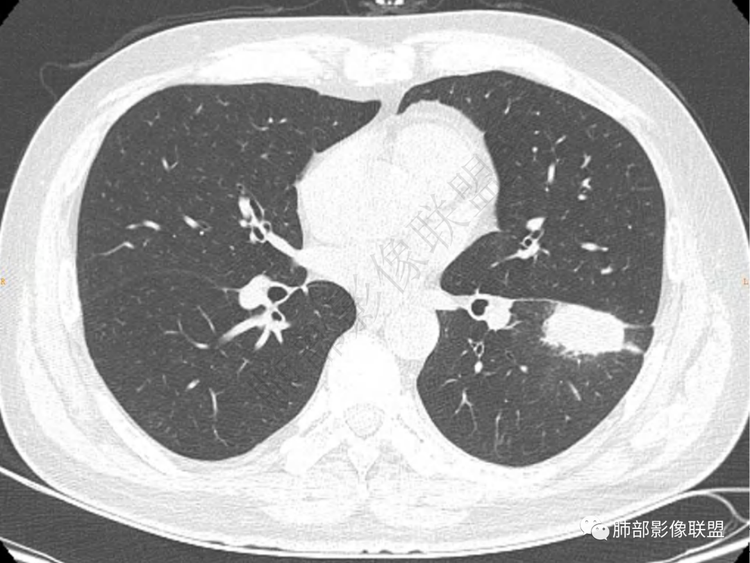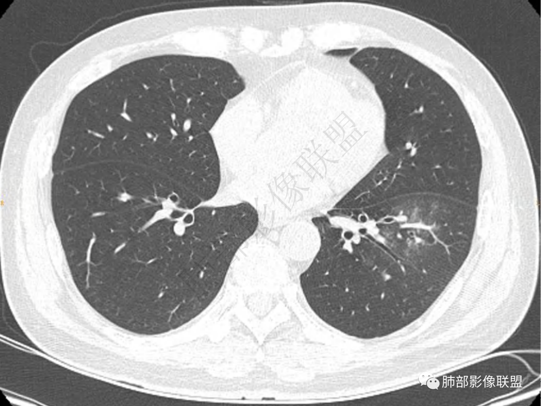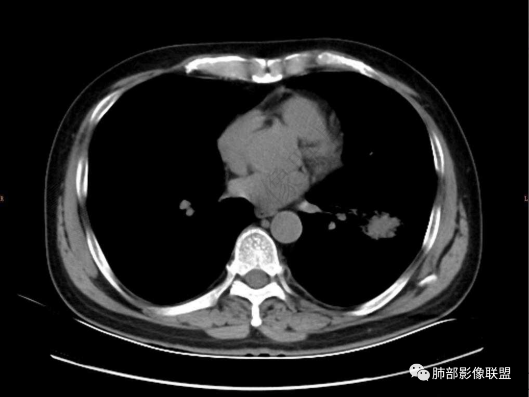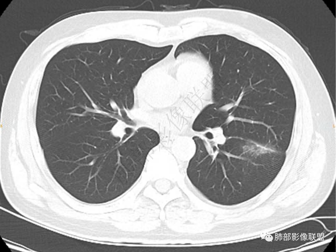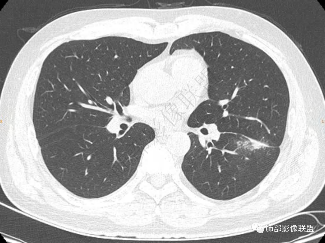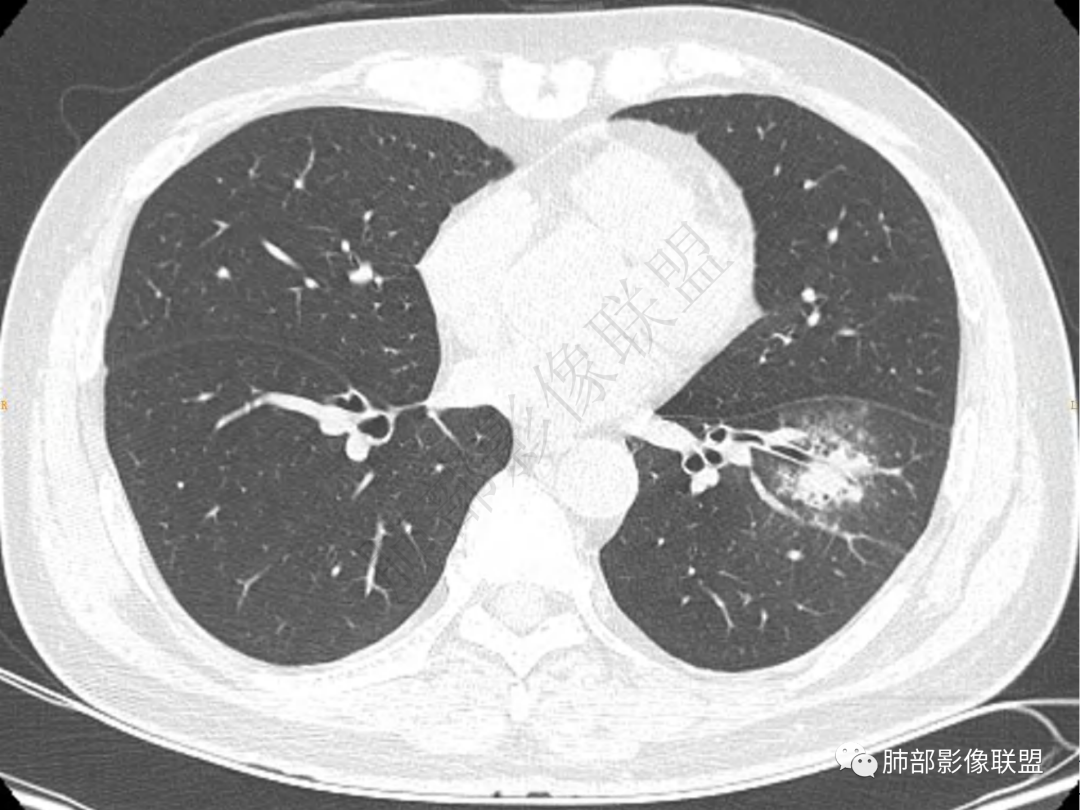 中年男性患者,咳嗽、咳痰20天,咳血2周,炎性指标正常,胸部CT:左肺下叶前基底段结节影,边界清楚,部分平直,部分彭隆,周边见界限清楚的磨玻璃影,分叶不明显,毛刺细软,强化均匀,周围见多发斑片状磨玻璃样密度影,首先考虑炎性病变