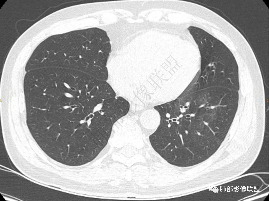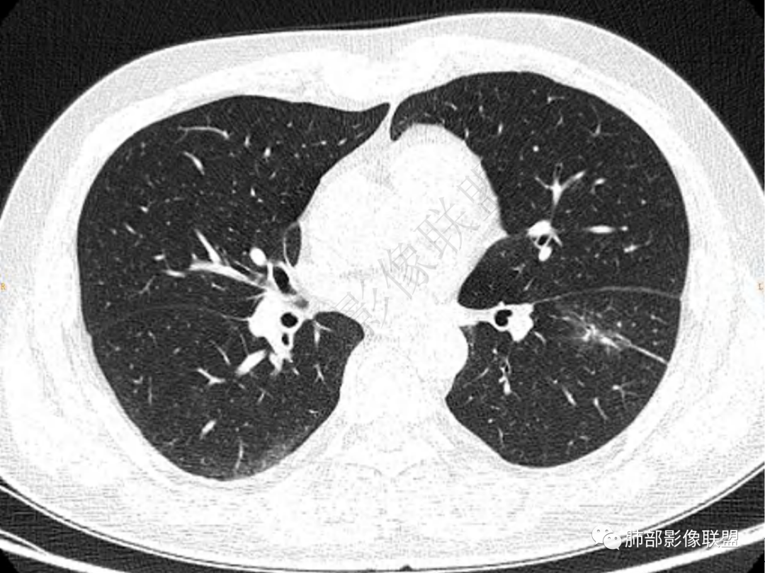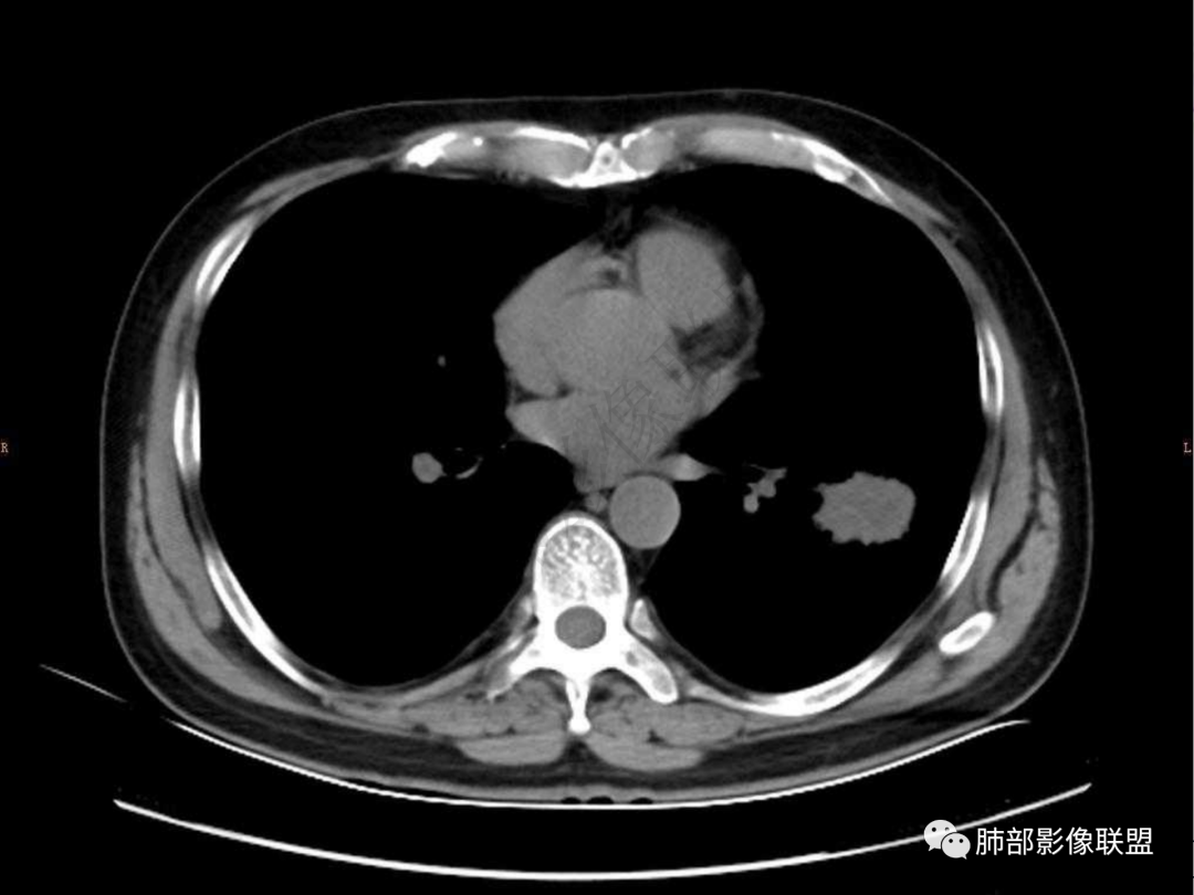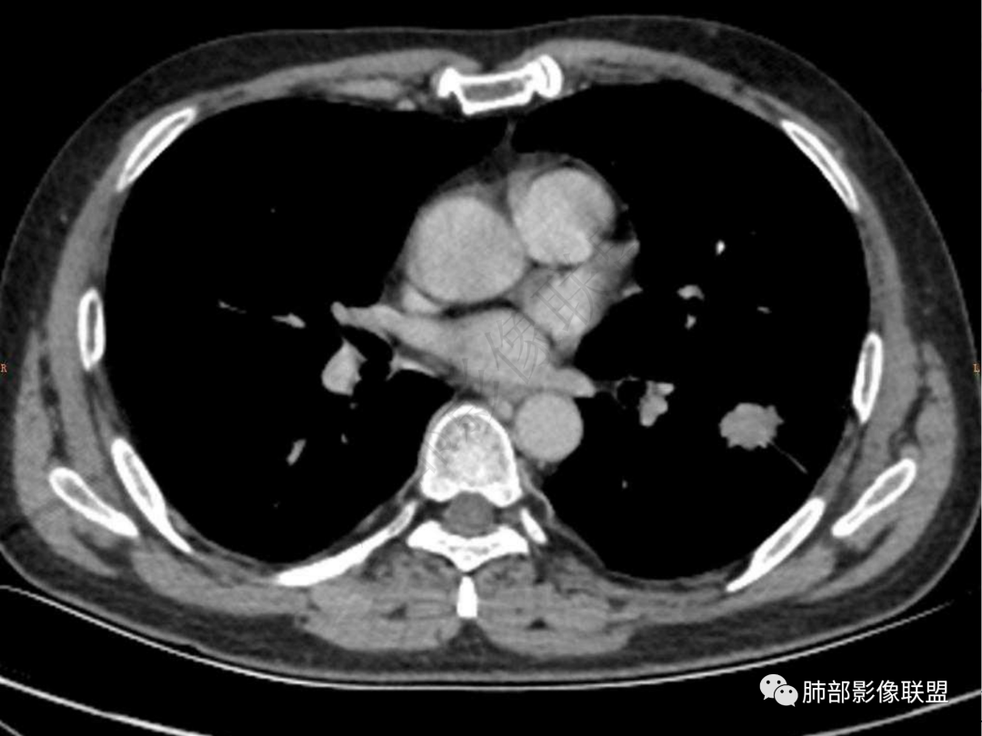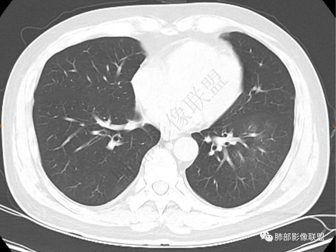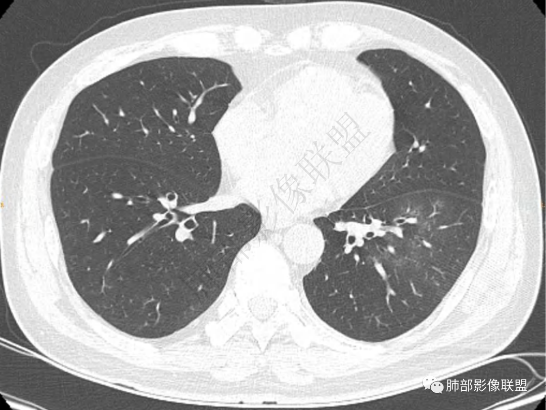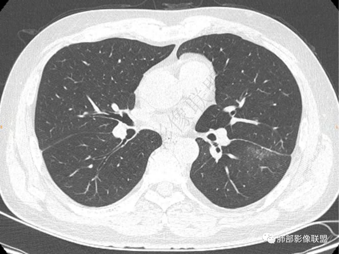中年男性患者,咳嗽、咳痰20天,咳血2周,炎性指标正常,胸部CT:左肺下叶前基底段结节影,边界清楚,部分平直,部分彭隆,周边见界限清楚的磨玻璃影,分叶不明显,毛刺细软,强化均匀,周围见多发斑片状磨玻璃样密度影,首先考虑炎性病变