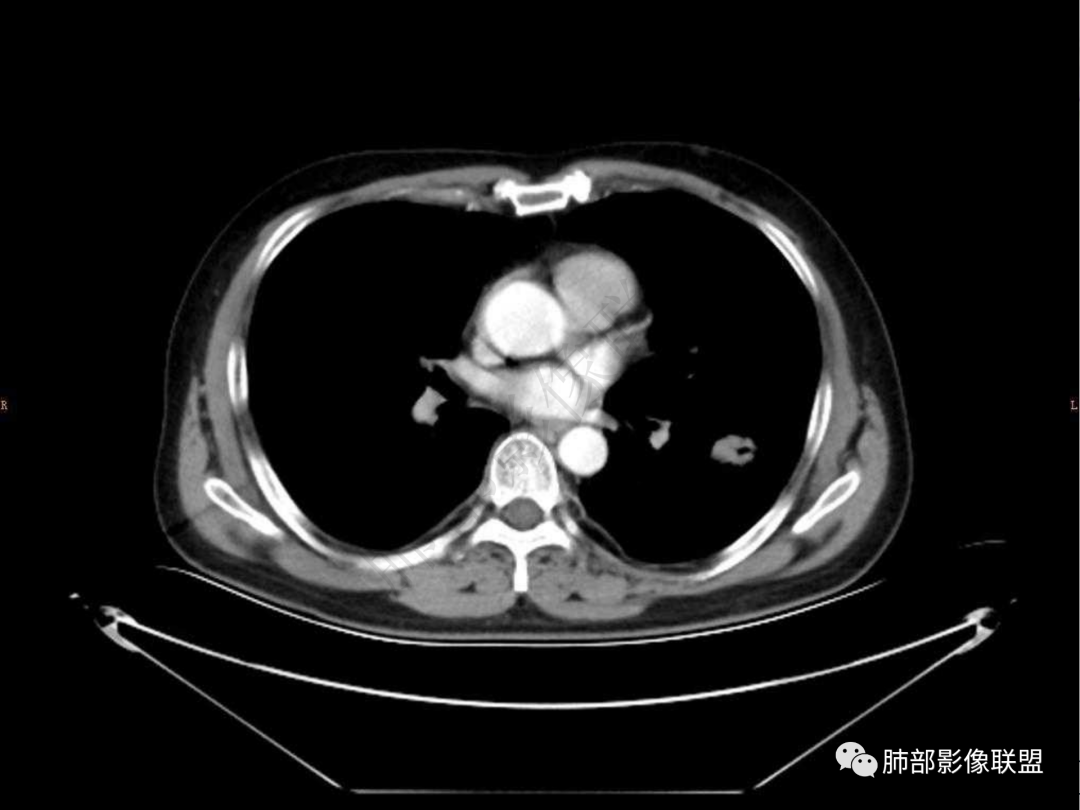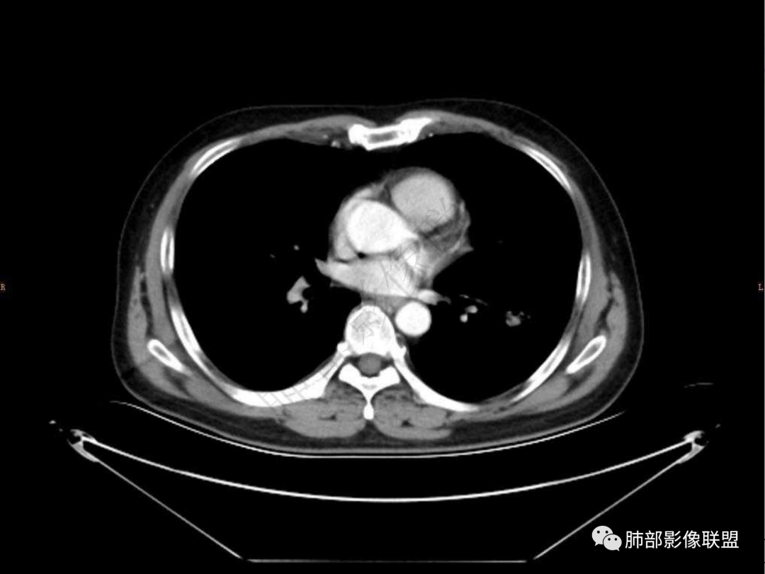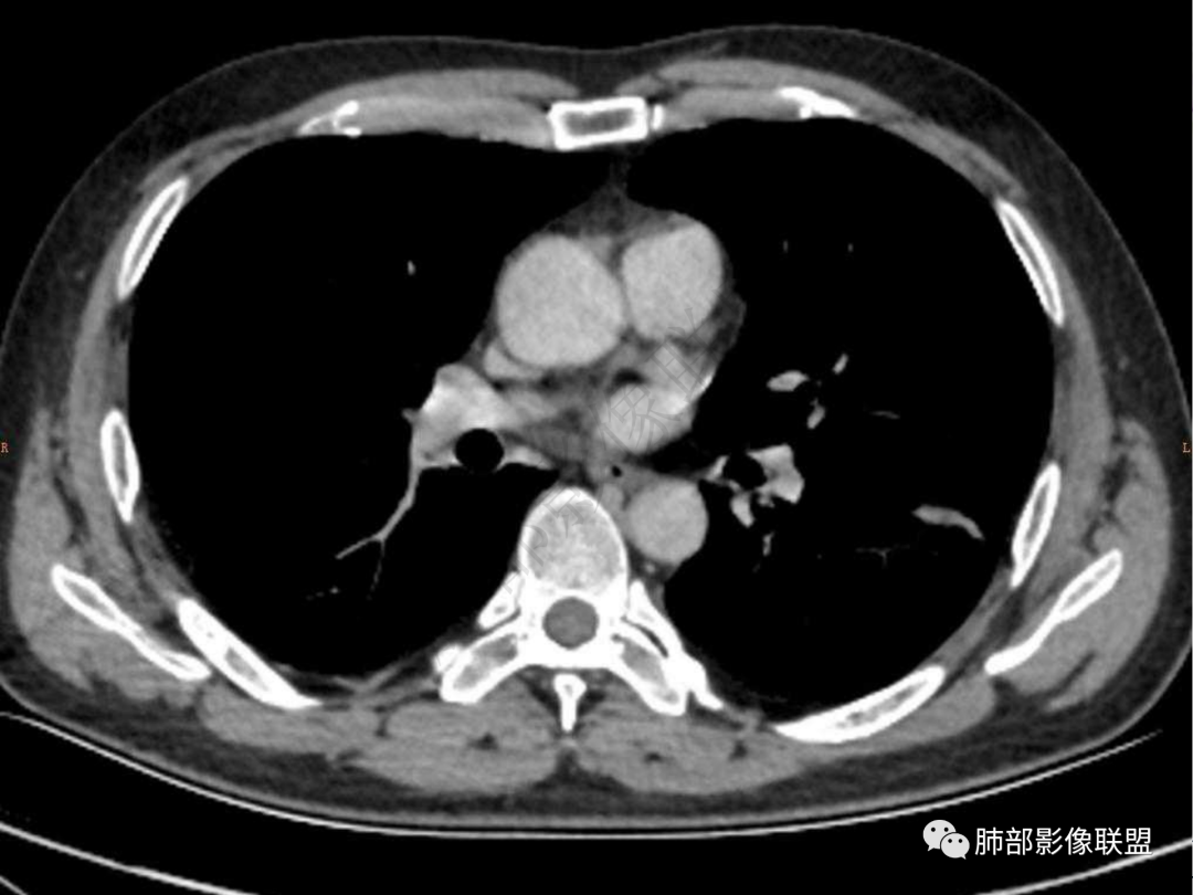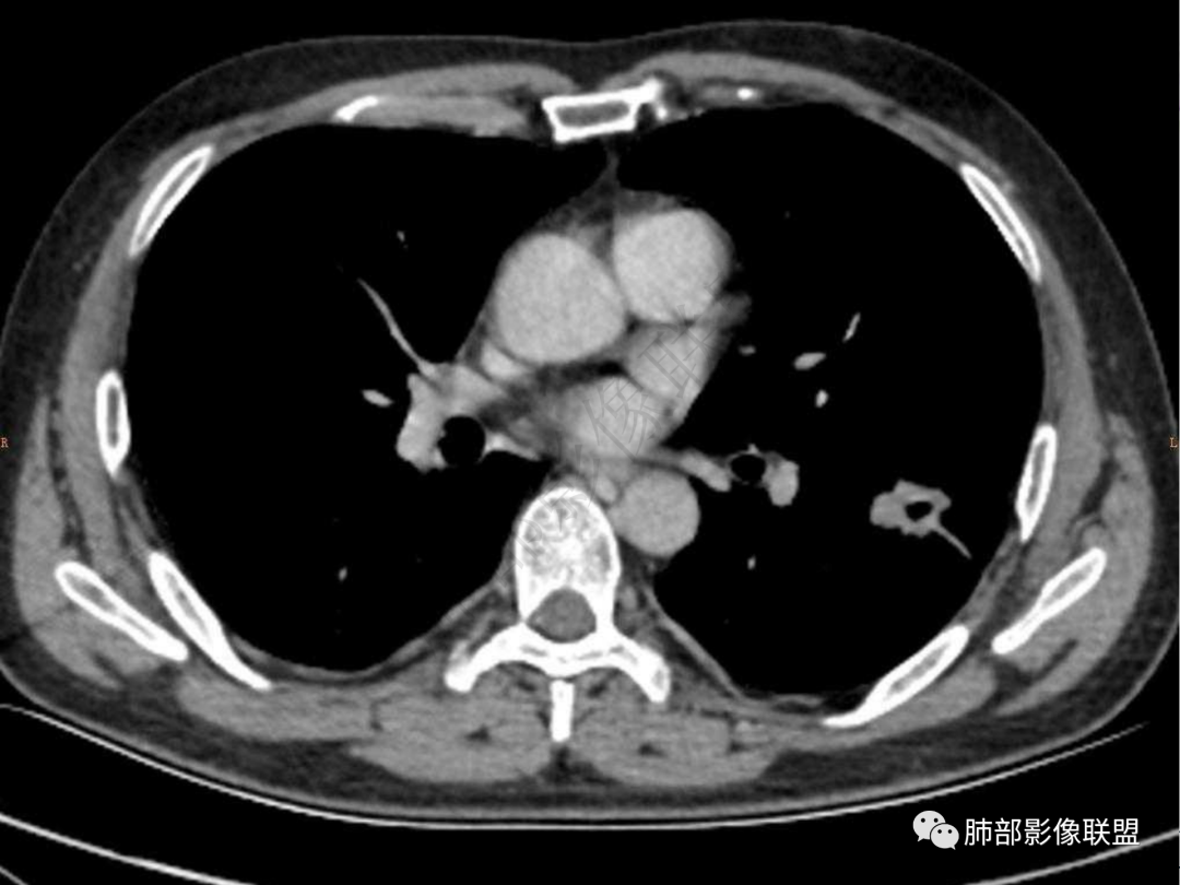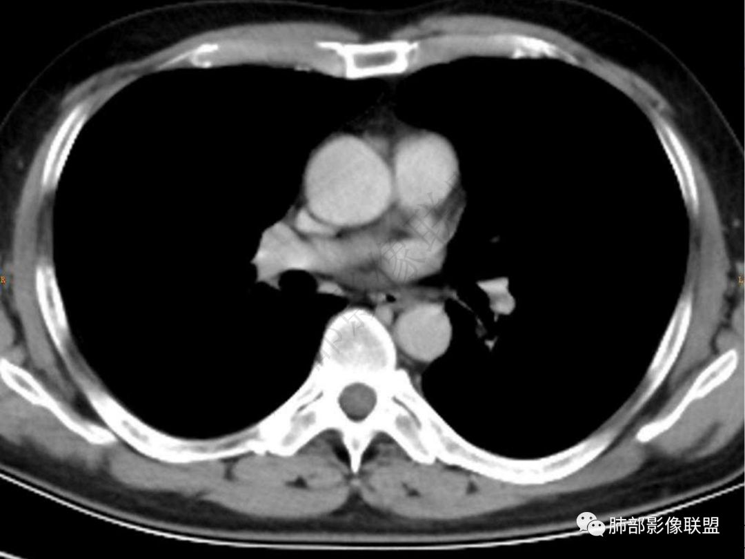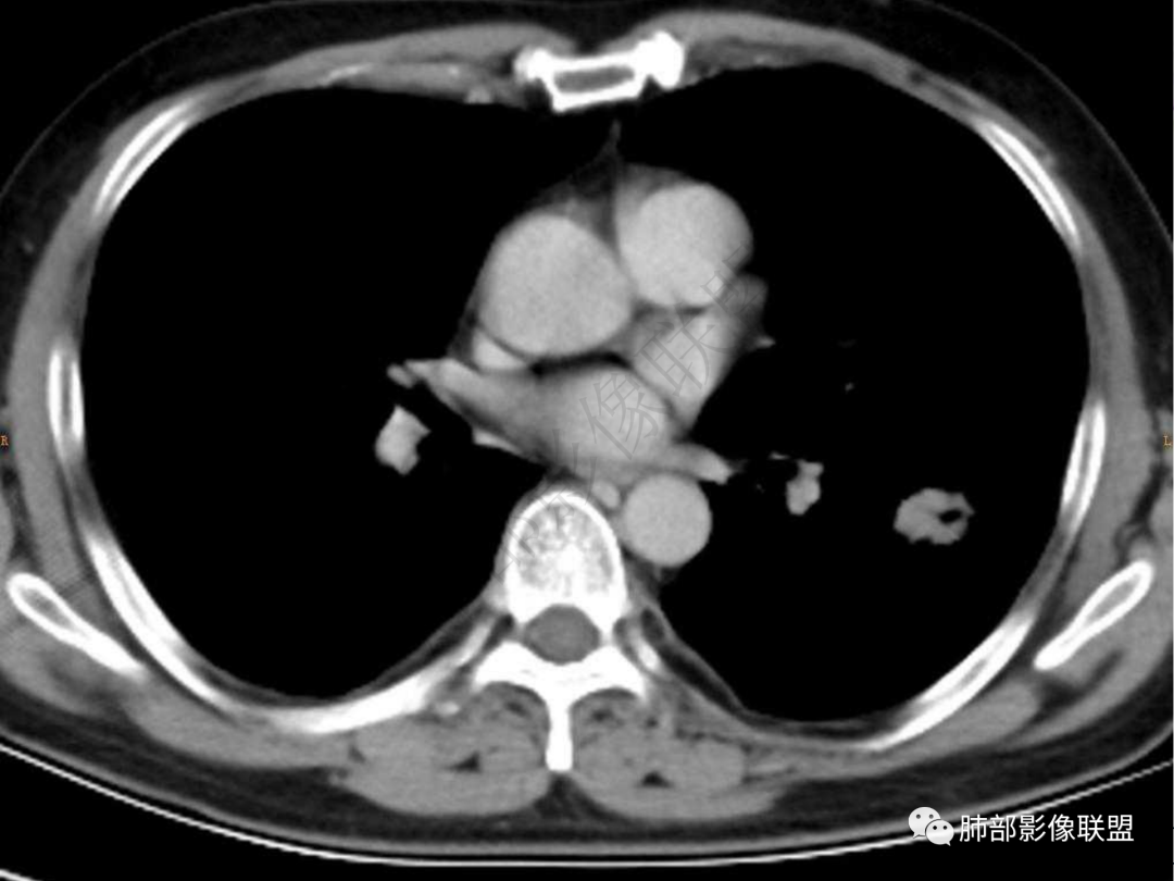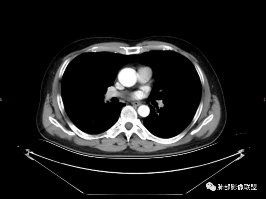4.实性部分不均匀环形强化并显示一小范围低密度坏死区或空洞。较之肺窗,整体纵隔窗范围较小,提示病灶并不十分密实。抑或为不同时段图像。