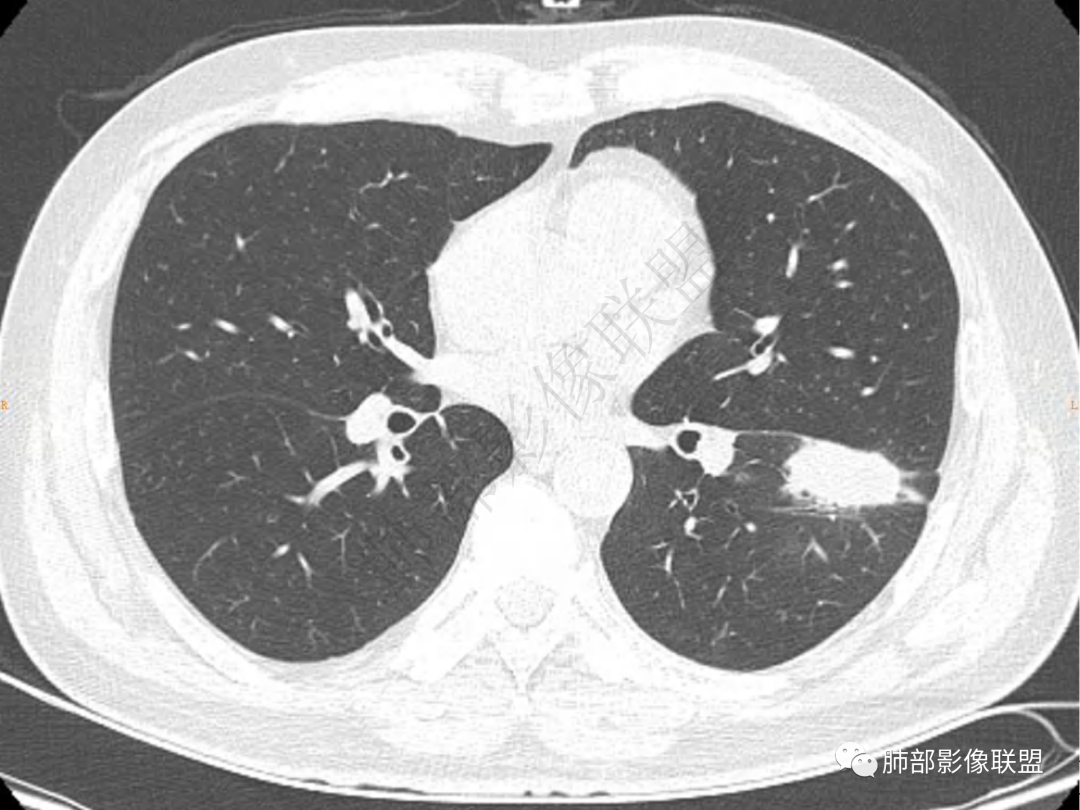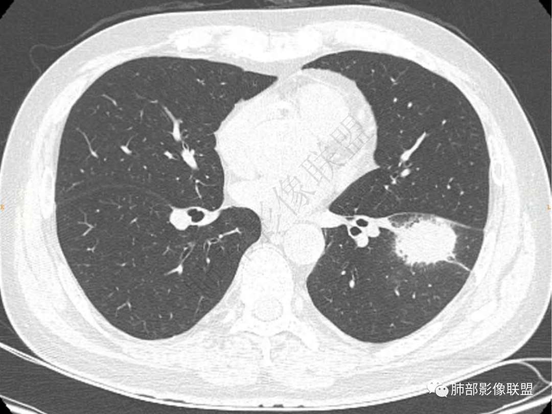 左肺下叶前基底段肿块影,边缘平直为主,稍膨隆,有分叶毛刺,支气管通畅,周围有磨玻璃及小斑片状影,内有坏死空洞,边界欠清,与叶间胸膜宽基底相贴,考虑炎性肉芽肿性病变,鉴别淋巴瘤