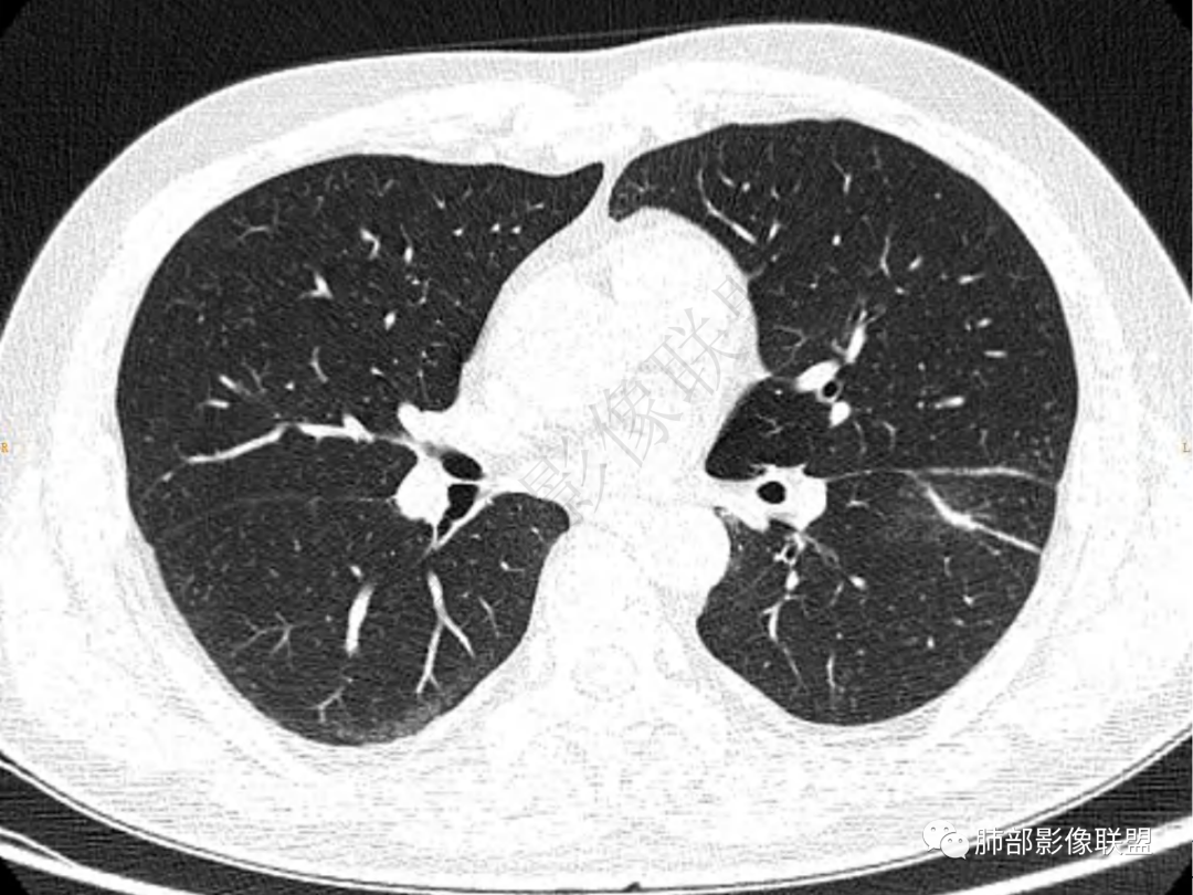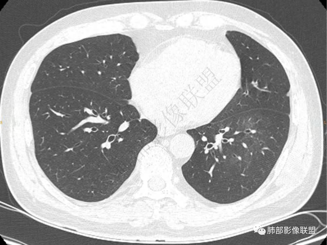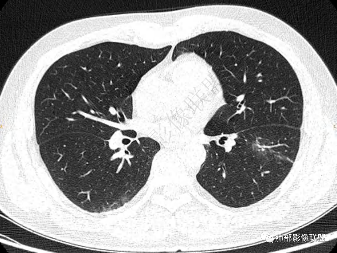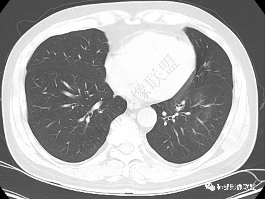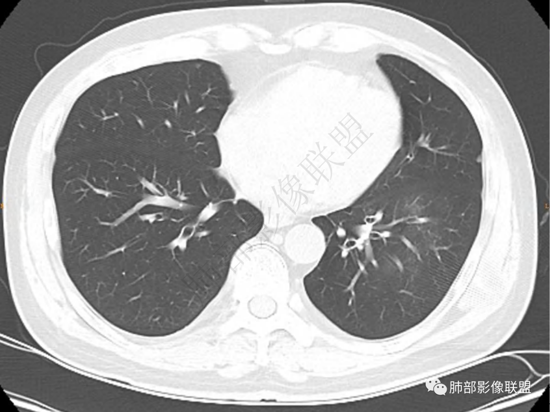 3.周边较大范围磨玻璃影,边界相当模糊,小叶增厚明显。注意叶裂另一侧、左肺舌段亦可见磨玻璃影及增厚的小叶间隔。未见明确卫星病灶。