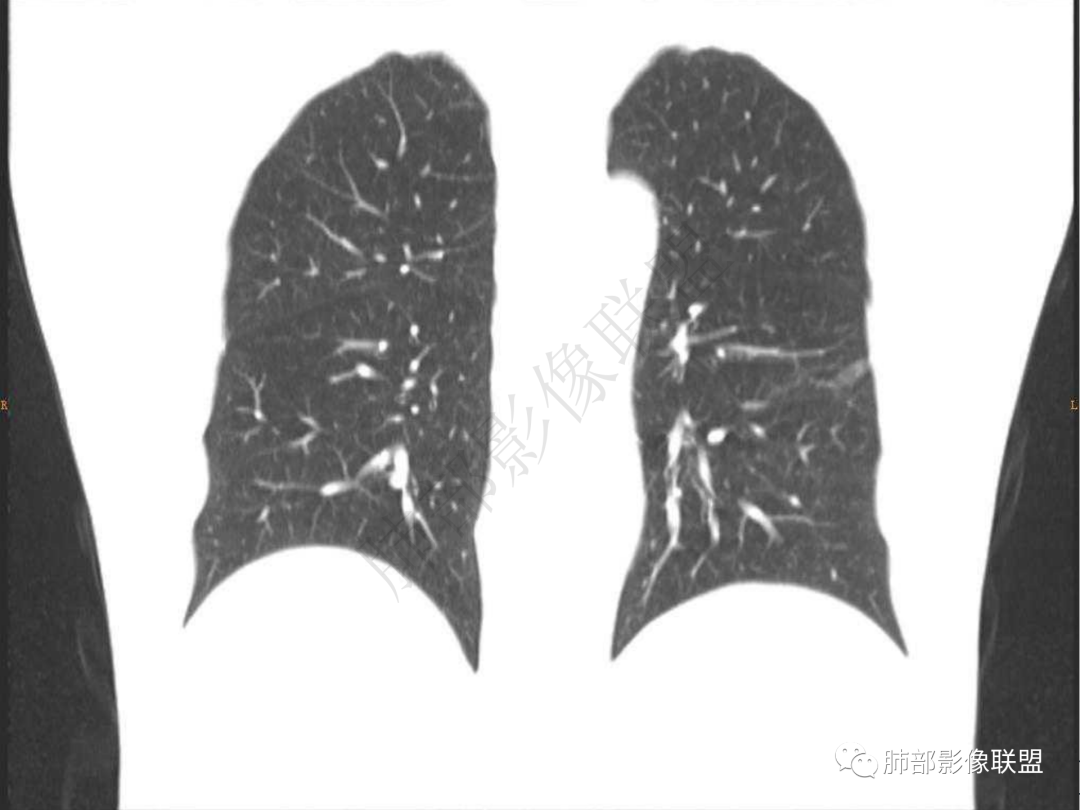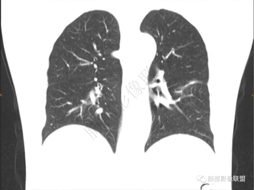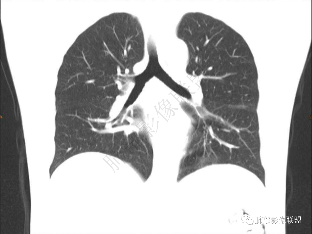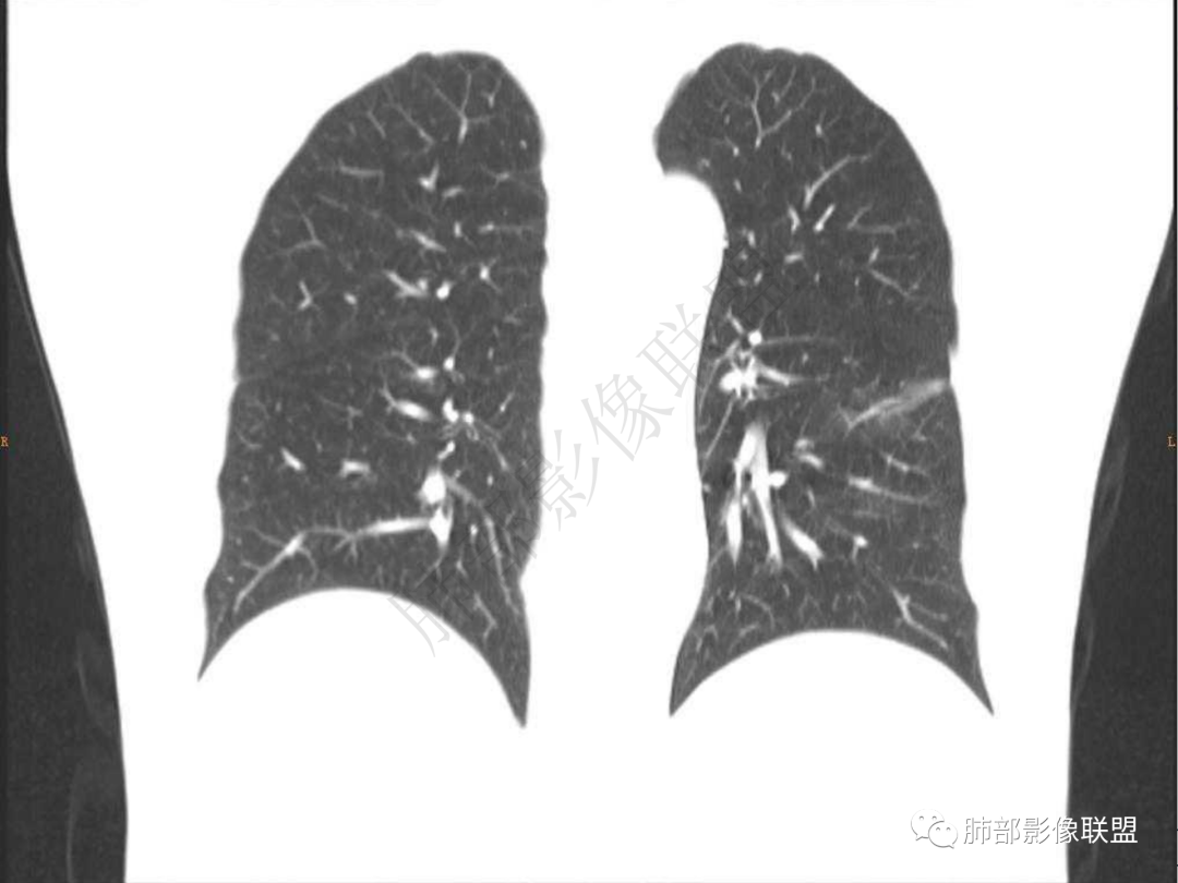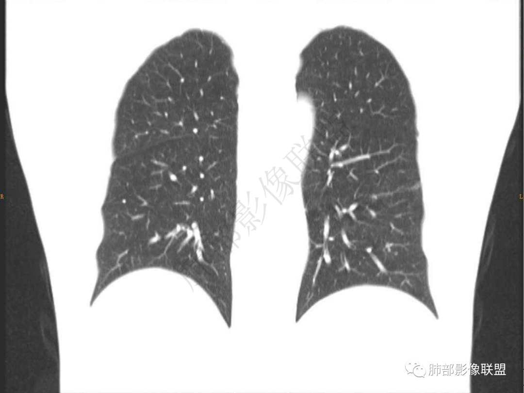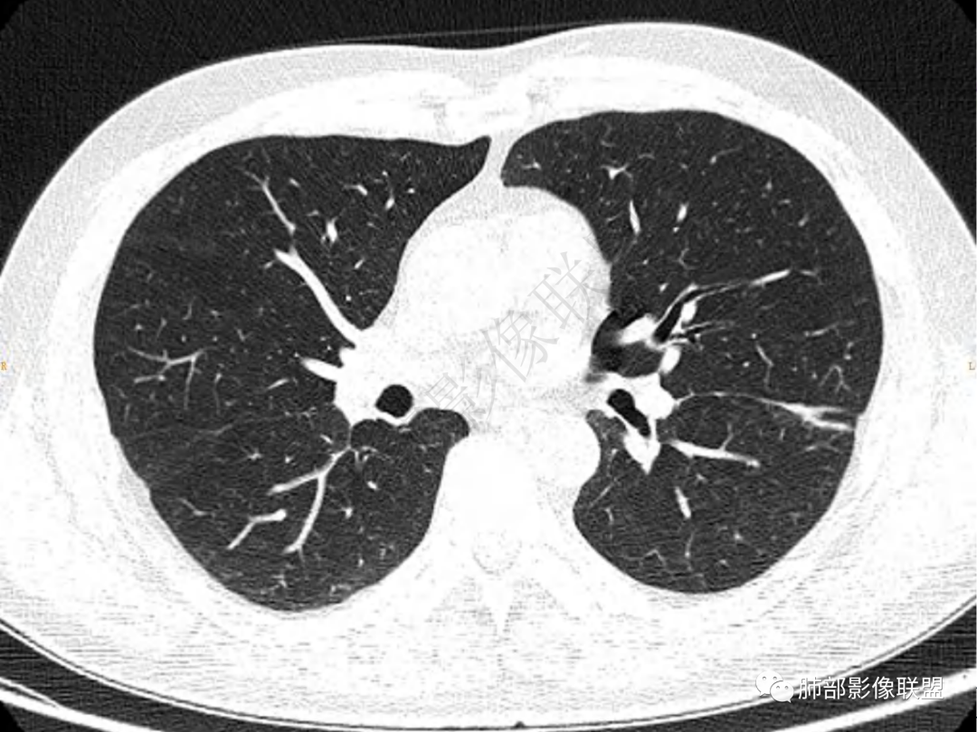 3.周边较大范围磨玻璃影,边界相当模糊,小叶增厚明显。注意叶裂另一侧、左肺舌段亦可见磨玻璃影及增厚的小叶间隔。未见明确卫星病灶。
