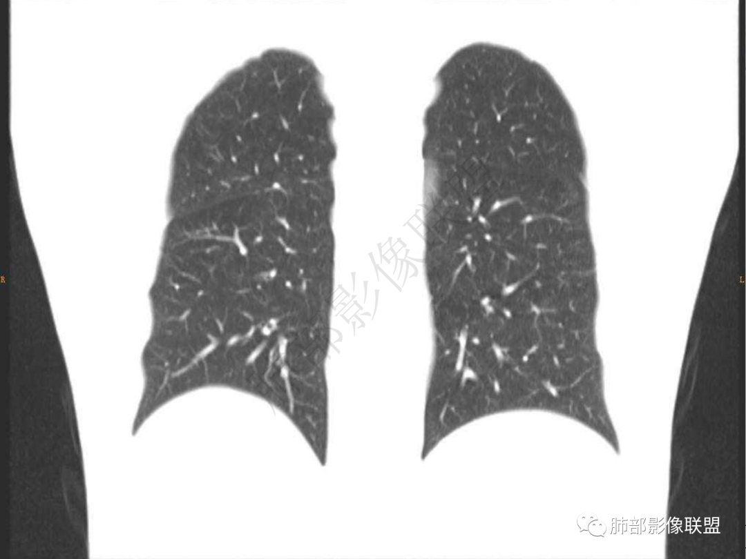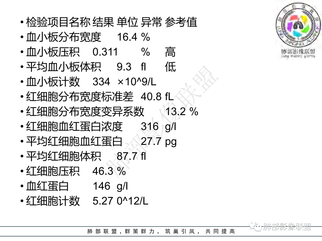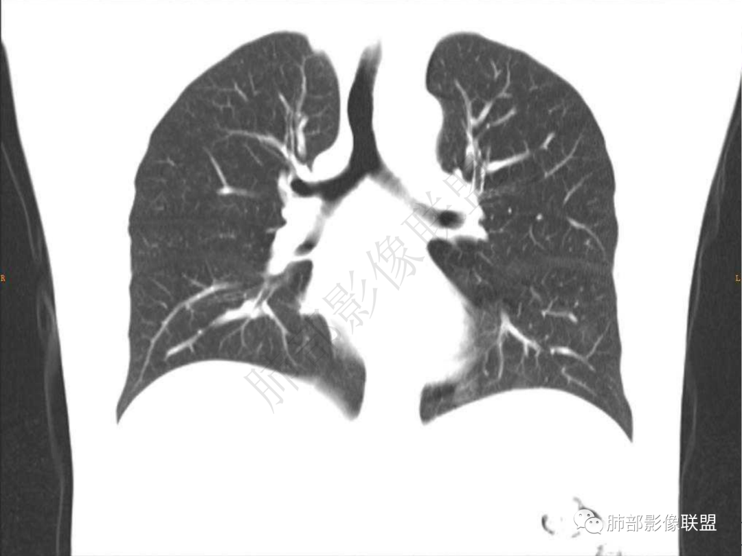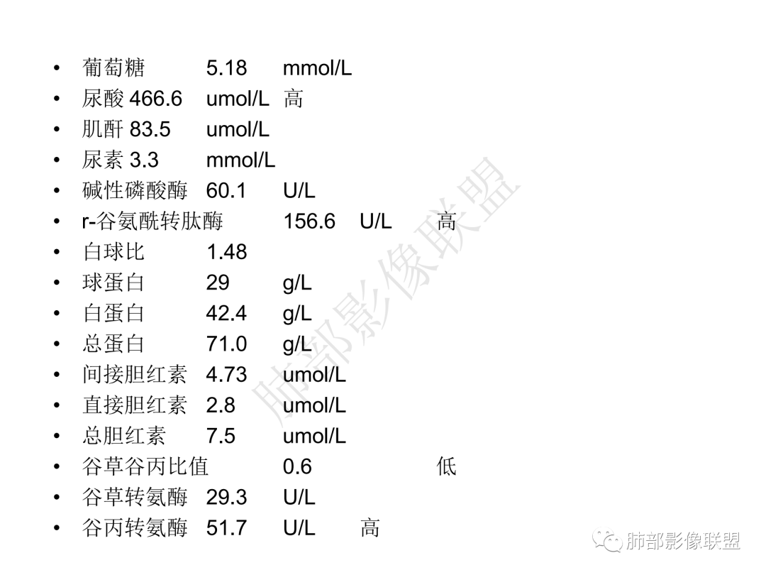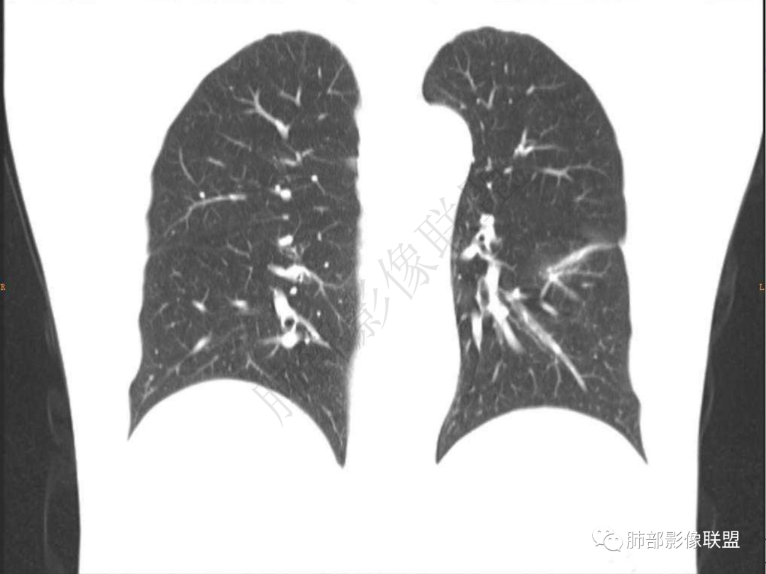 3.周边较大范围磨玻璃影,边界相当模糊,小叶增厚明显。注意叶裂另一侧、左肺舌段亦可见磨玻璃影及增厚的小叶间隔。未见明确卫星病灶。