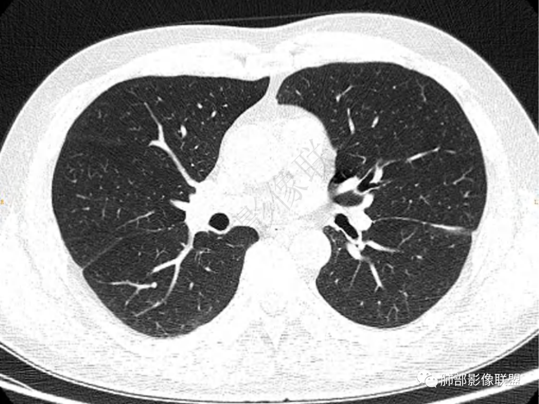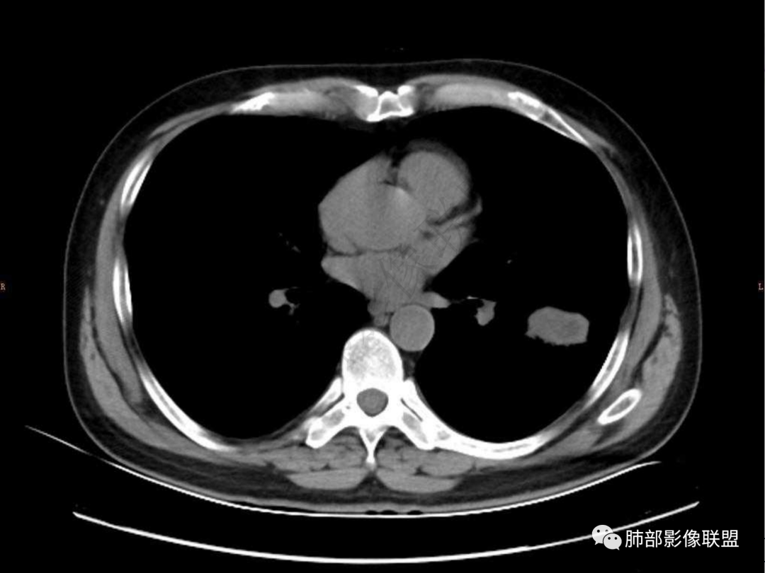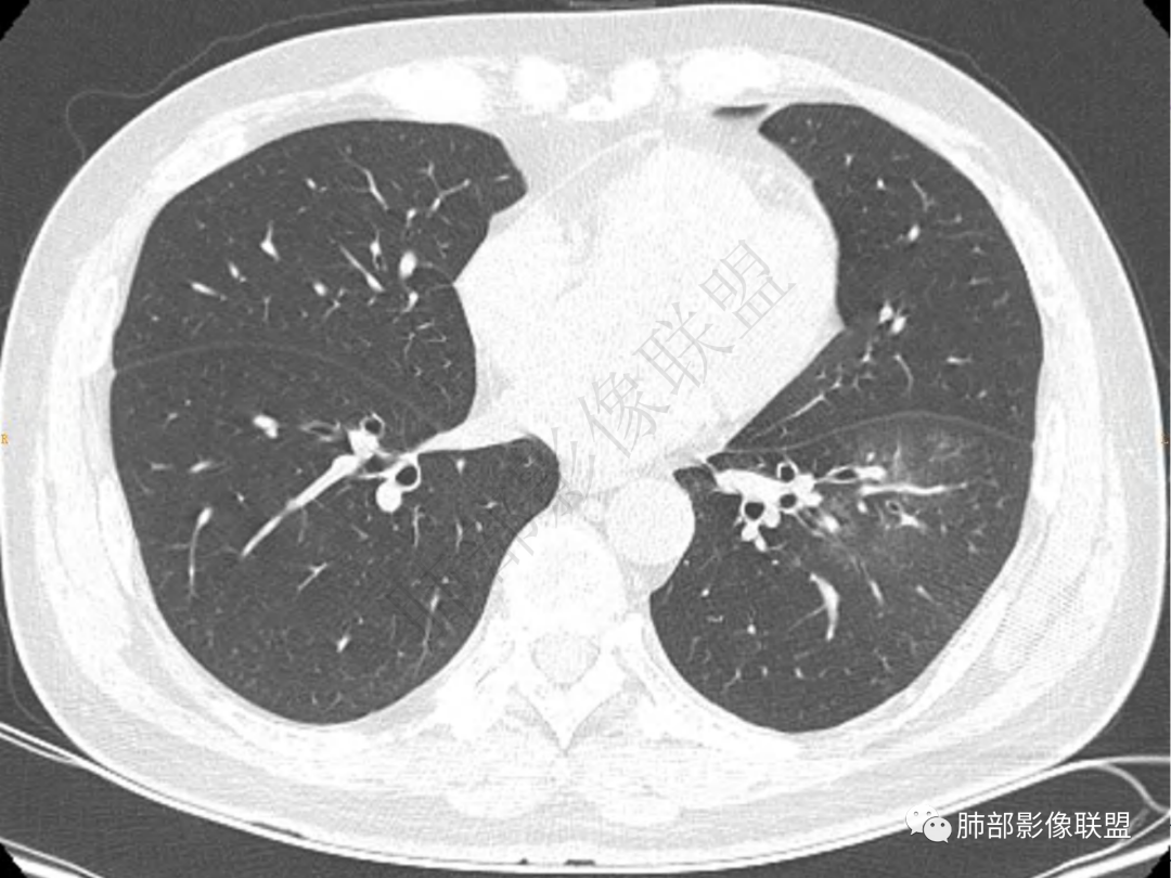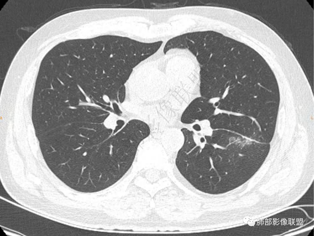 男,51岁,咳嗽咳痰就诊,咳黄脓痰,治疗后咯血,左肺下叶叶间胸膜下团块影,宽基底与斜裂相连,周边伴磨玻璃影及条索影,平扫密度均匀,支气管扩张,增强可见强化,首先考虑为炎性病变,鉴别淋巴瘤