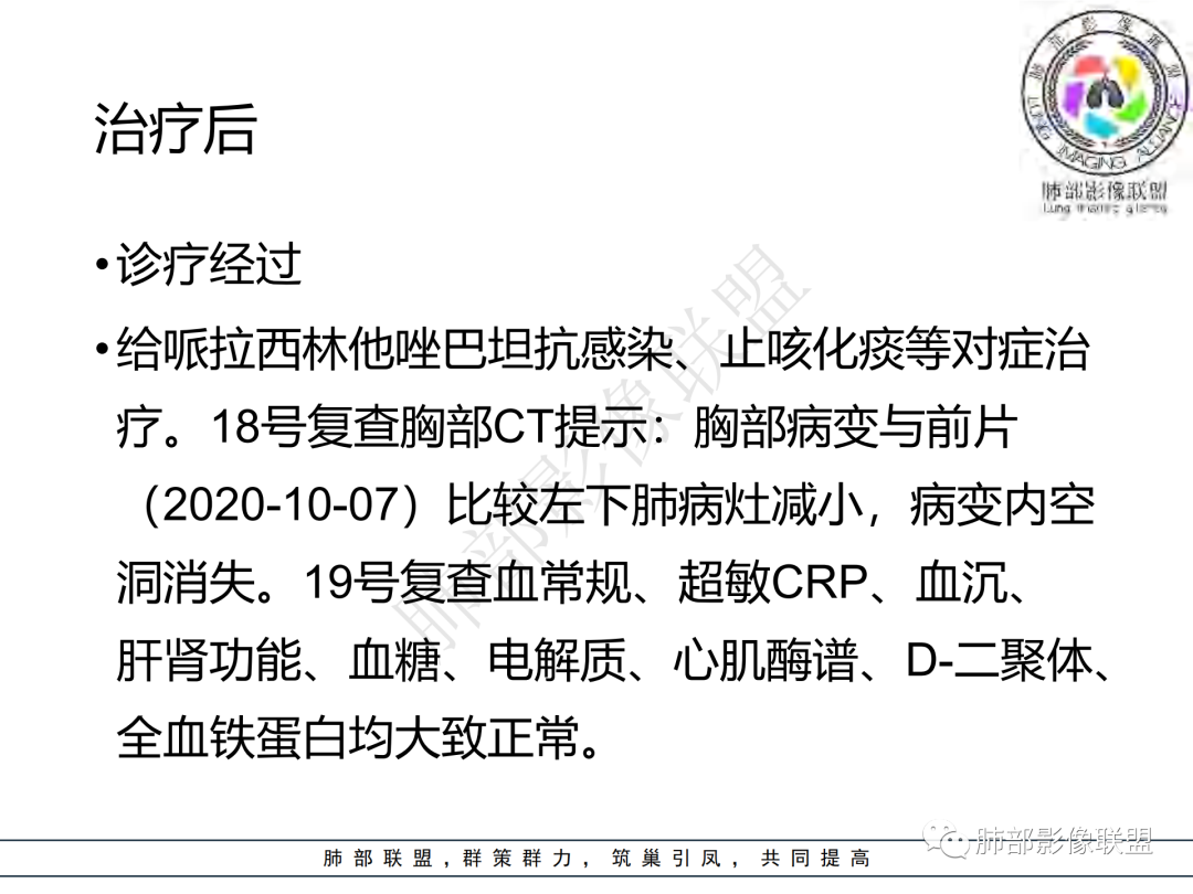 左肺下叶前内基底段肿块,跨叶,边缘不清,周围散在磨玻璃密度影,偏下方支气管壁增厚,腔内偏一侧增厚,腔狭窄(痰栓?炎性?),纵隔窗纵隔内见空洞(似乎近背侧方向,治疗后?),中年男性,抗炎治疗后有效,考虑炎性,建议继续抗炎治疗后复查