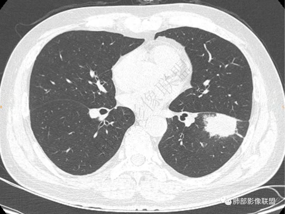 左下肺肿块,边界不清,可见晕征及软毛刺,紧貼叶间胸膜但胸膜无牵拉移位,引流支气管管壁增厚,结节内有支气管穿行,显著强化,并见血管飘浮,纵隔窗肿块有平直及u型凹陷,综和考虑1.隐球菌,2.OP併脓肿,3.病史长,年龄大,淋巴瘤也要排除