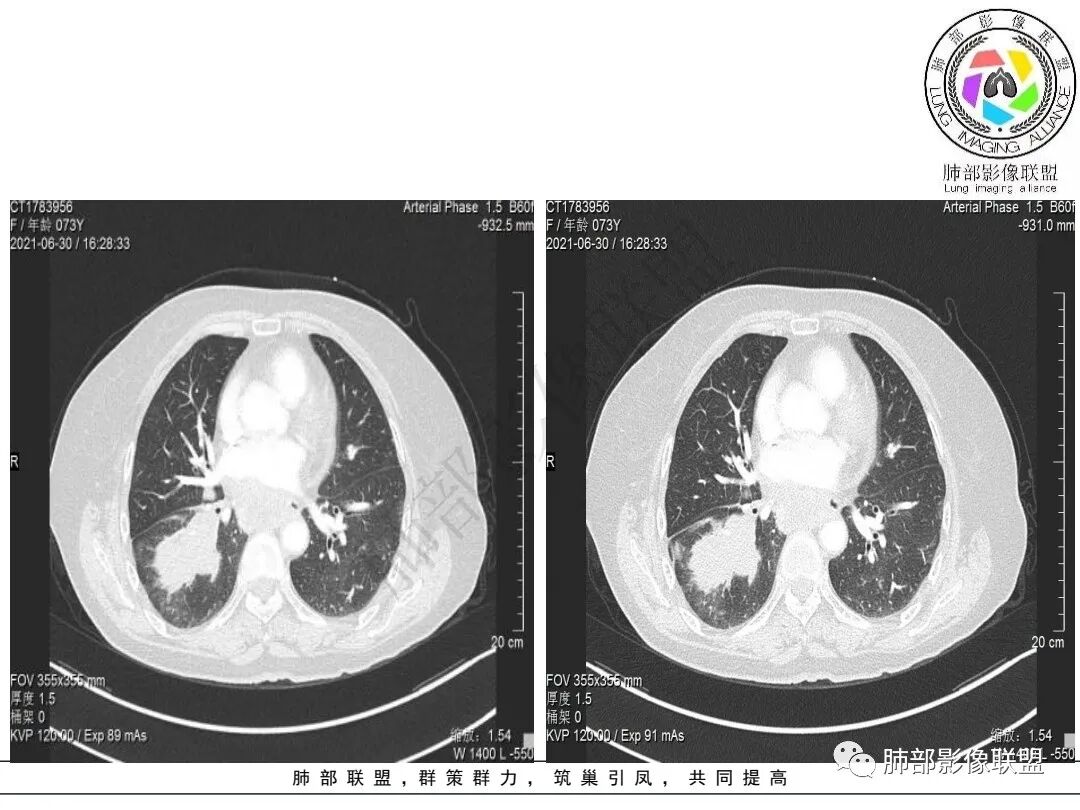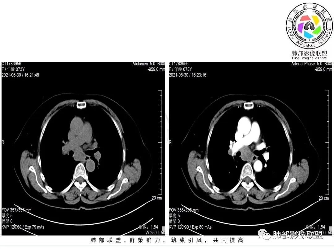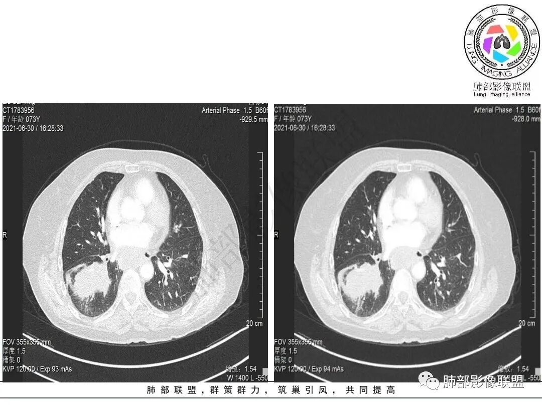 如果只能选之一的话,考虑低分化腺癌! 不管是病灶内低强化、外向内发展趋势、胸膜栽桩、病灶内血管破坏、大血管侵犯、病灶内可见支气管气像,病灶边缘毛躁、老年女性就可以解释了