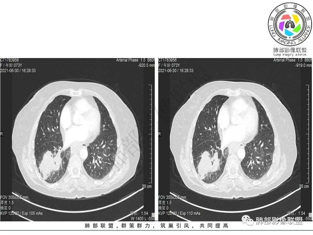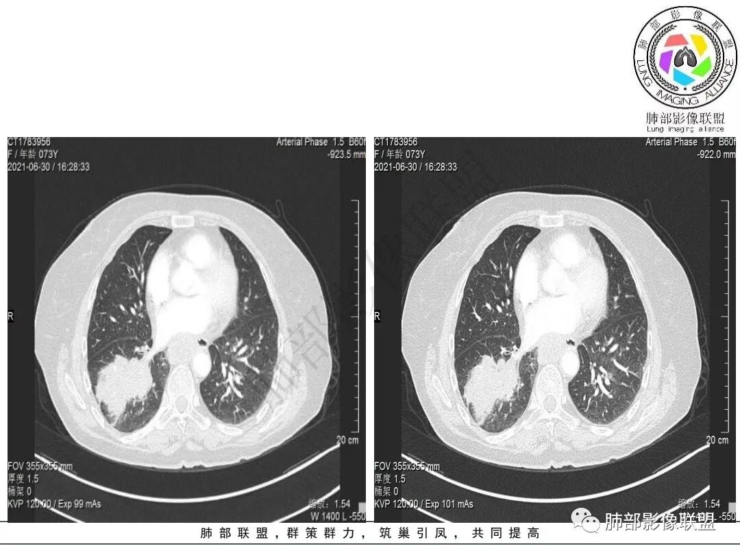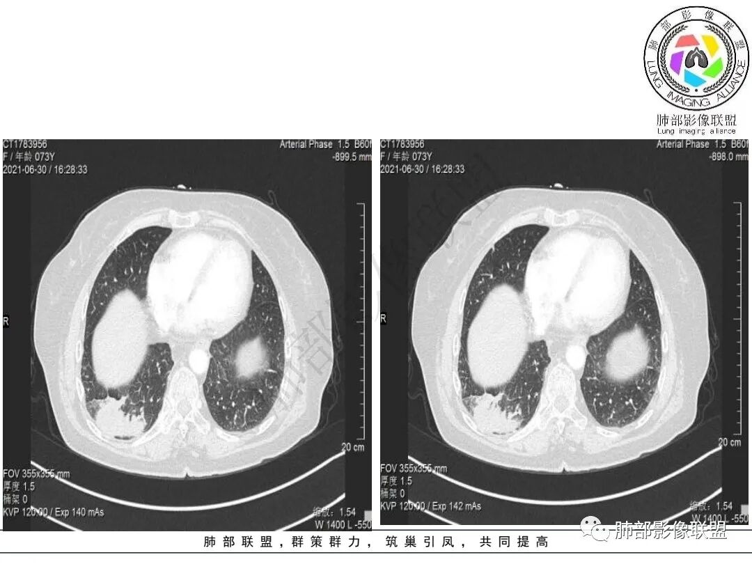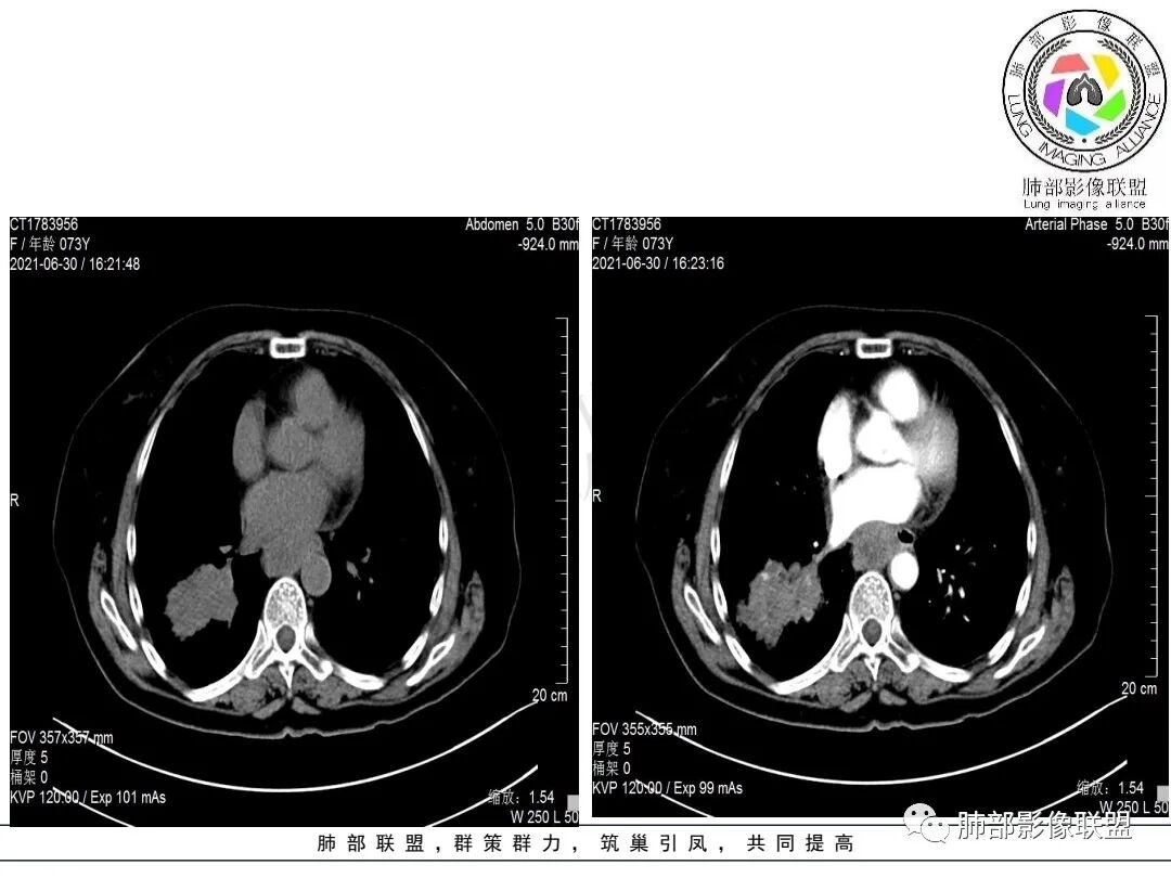 女,73岁,右肺下叶不规则形软组织密度肿块影,边界清晰,密度均匀,边缘见深分叶及细短毛刺,病灶旁另见实性结节影,增强扫描,病灶呈不均匀性强化,纵隔内见肿大淋巴结,考虑恶性病变,小细胞癌,鳞癌可能。