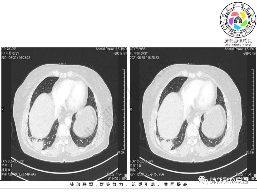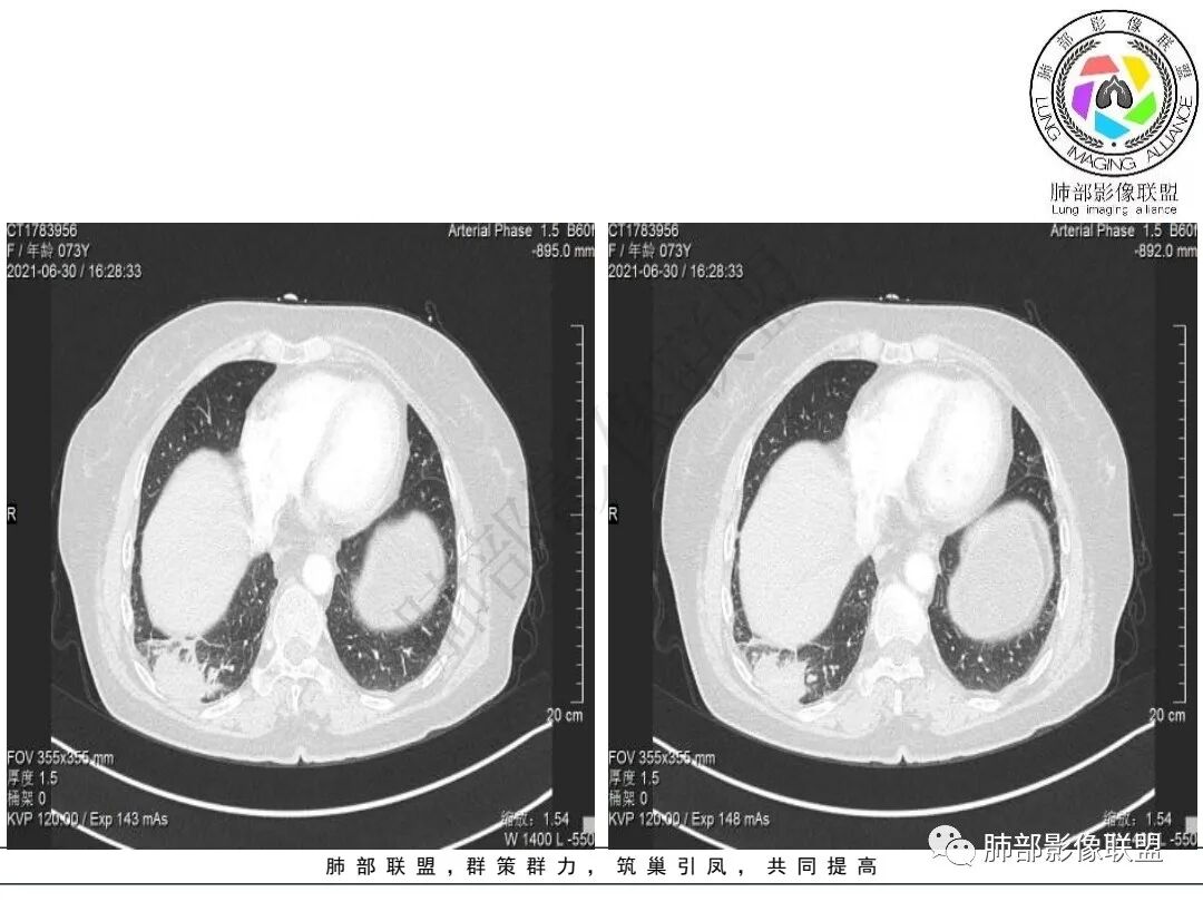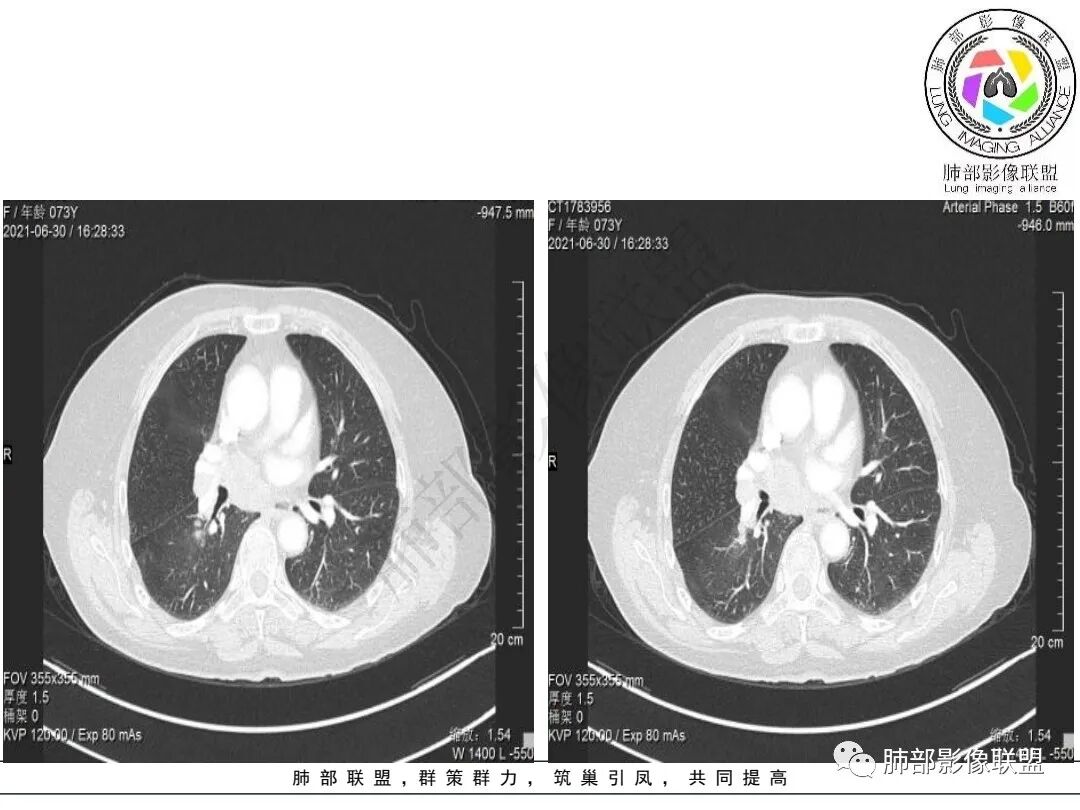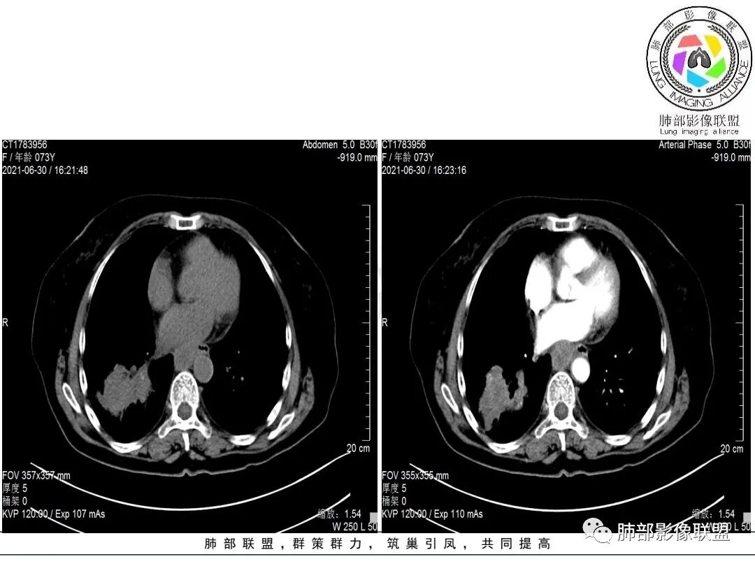 女,73岁,右肺下叶不规则形软组织密度肿块影,边界清晰,密度均匀,边缘见深分叶及细短毛刺,病灶旁另见实性结节影,增强扫描,病灶呈不均匀性强化,纵隔内见肿大淋巴结,考虑恶性病变,小细胞癌,鳞癌可能。
