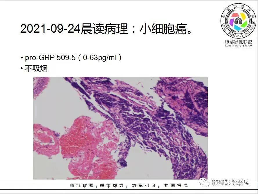 @洪桥爱 湘西自治州人民医院感染科 今天这个真不好猜。小可以,低腺可以,腺鳞复合癌可以,肉瘤样癌可以,复合性小细胞癌也可以。不管最后结果是哪一个,这影像表现都有符合的地方。这种就算平时写报告,也不敢轻易去说病理是什么,所以强行猜测也没啥意义了。