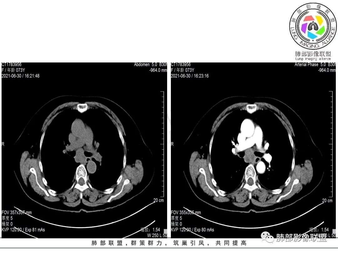 强化不明显,纵膈淋巴结肿大融合,考虑小,鉴别腺癌