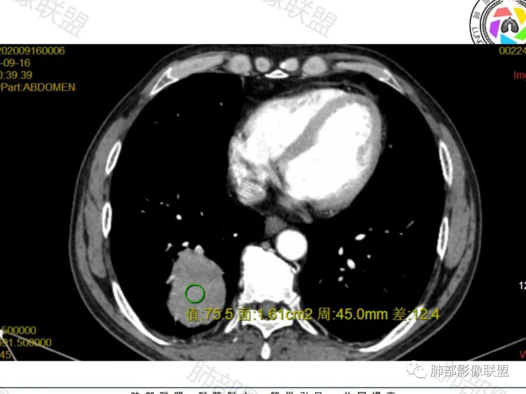 老年男性,右肺下叶软组织肿物,整体外形光整,周围组织推挤,可见血管贴边,貌似又有血管进入,整体强化均匀,考虑良性可能大,硬化性肺细胞瘤?鉴别sft