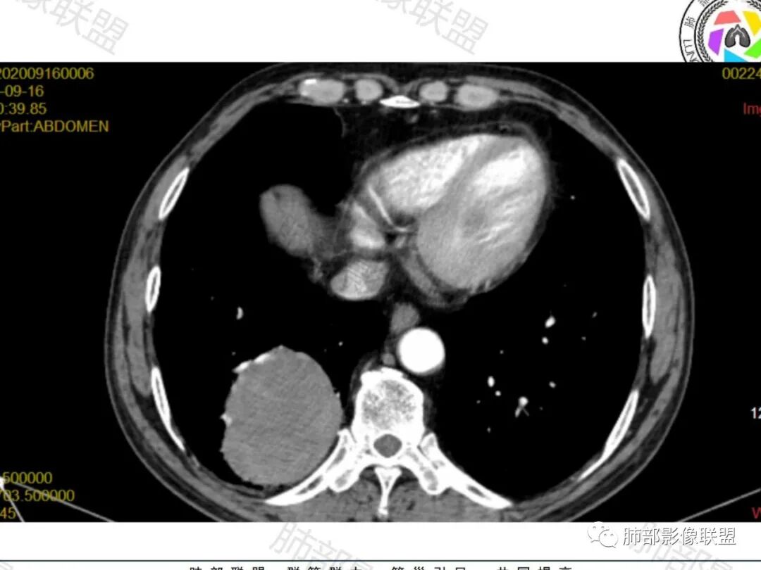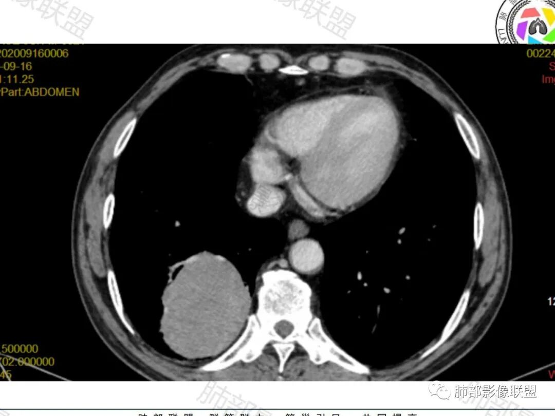 老年男性,右肺下叶肿块,边缘光整,血管贴边,部分血管进入,整体强化尚均匀,考虑大细胞癌,鉴别PSP、SFT