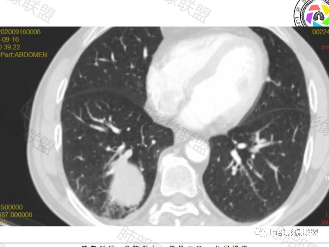 支气管没有堵塞,无明显坏死不符合鳞癌,无淋巴结肿大不符合小细胞肺癌,无分叶,这样的腺癌也比较少见,一般这么大肿块如果是腺癌一般生长速度不同的,形态不符合。本例边缘朋友还是支持肿瘤而非炎症了。