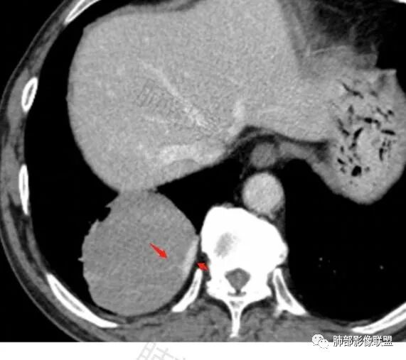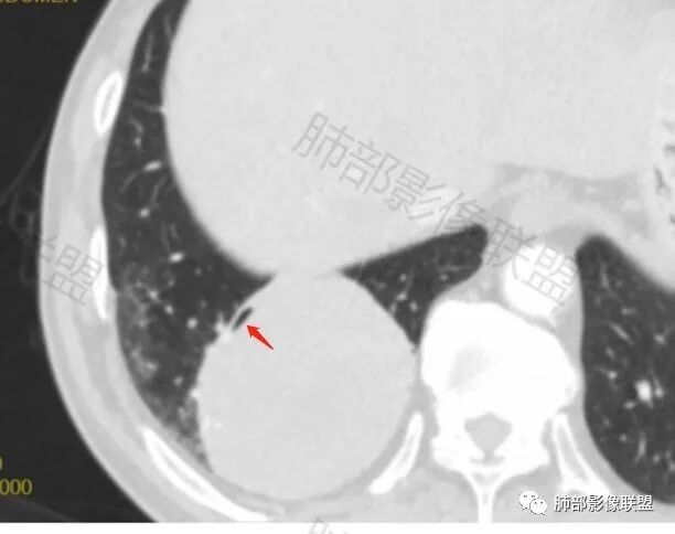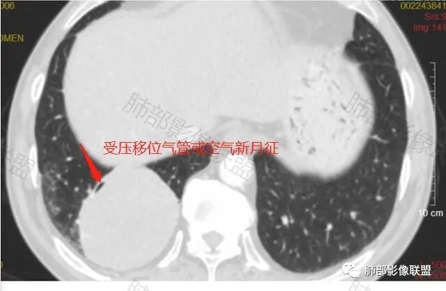 常规肿瘤如果背侧胸膜来源,肿瘤与胸膜之间不应该夹杂含气支气管,会推移