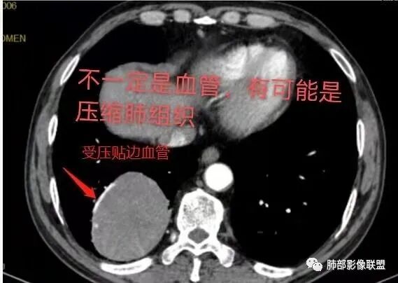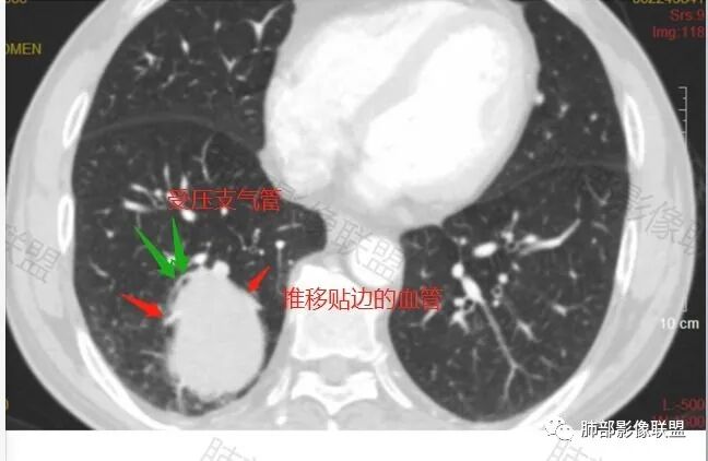 4. 大多有血管支气管贴边征,血管离开时比原来细一些(留下买路钱)。