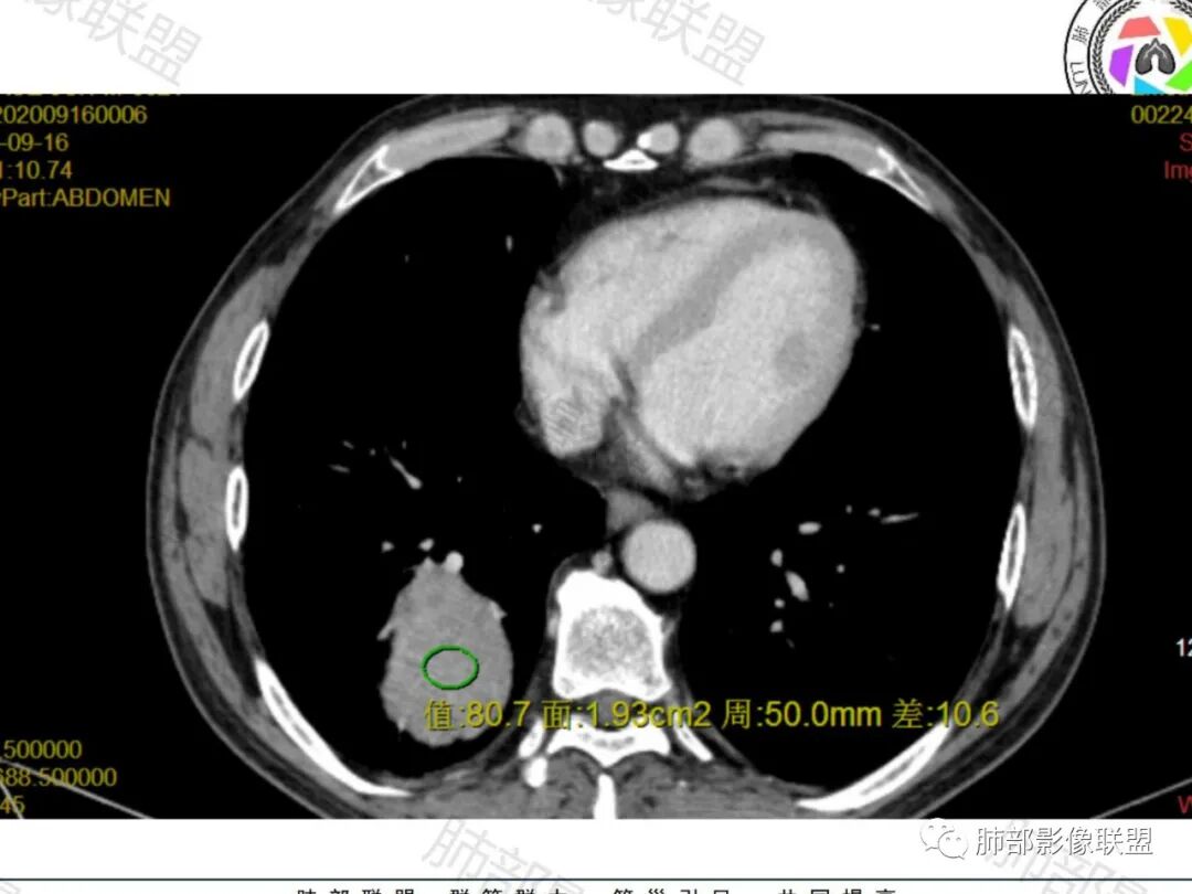右肺下叶肿块,呈外带大内带小的椭圆形改变(内带受支气管及血管挤压原因),边缘光滑,无分叶毛刺,支气管受压,增强后,均匀延迟强化,动脉期见血管贴边,静脉期内部瘤样血管强化区,相邻胸膜无侵犯,纵隔无淋巴结肿大,符合PSP,不鉴别。