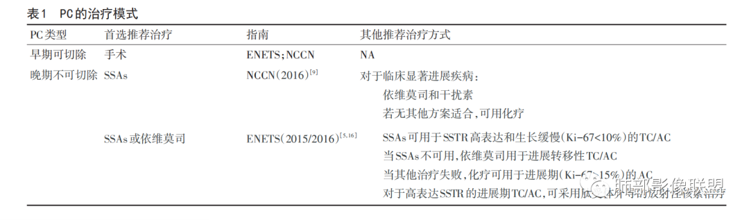 3.晚期/转移性 PC的治疗选择包括SSAs、靶向治疗、干扰素、化疗和肽受体放射性核素治疗(somatostatin receptors,SSTR) 等。依维莫司目前是唯一经美国食品药品监督管理局(FDA)批准治疗 PC 的药物,被 ENETS 推荐作为一线药物。