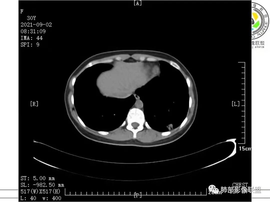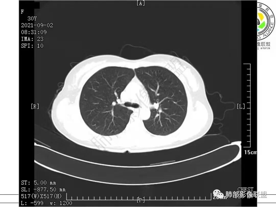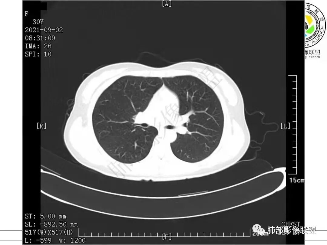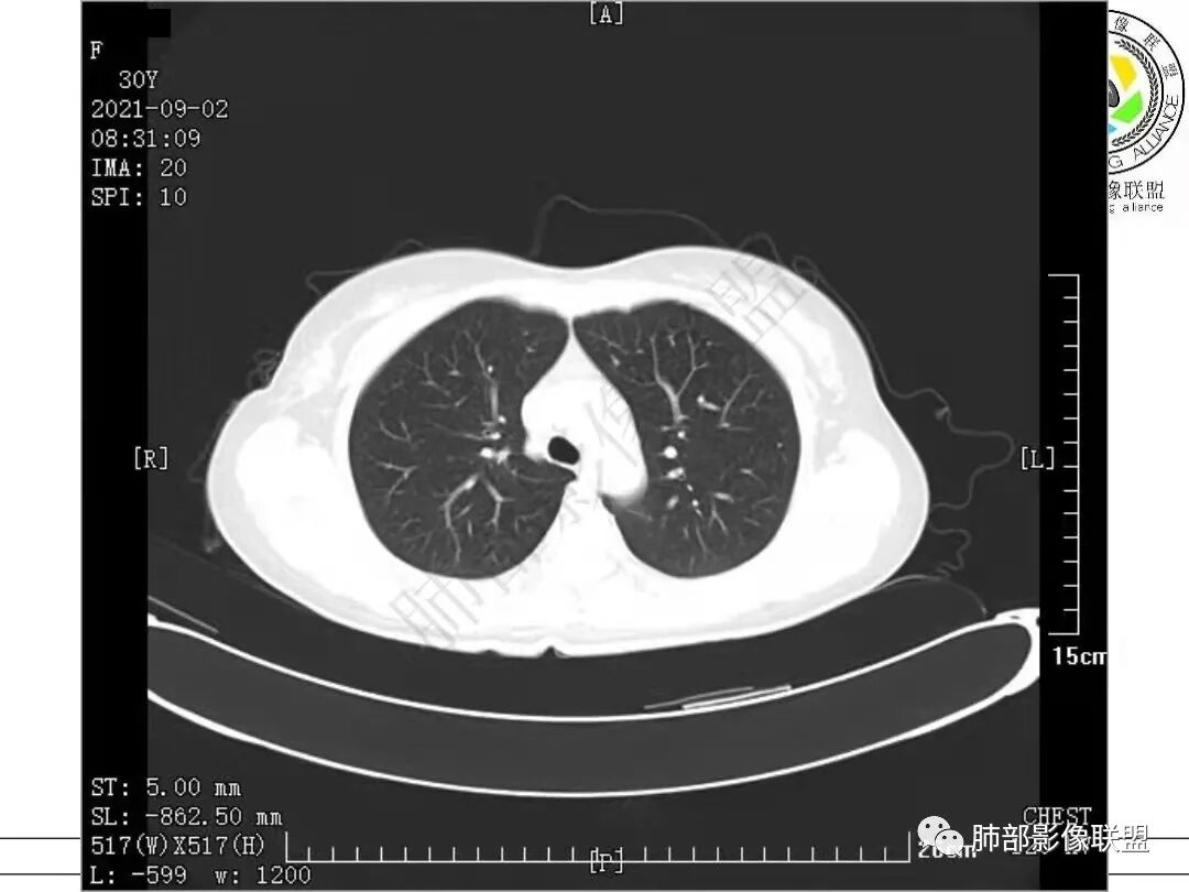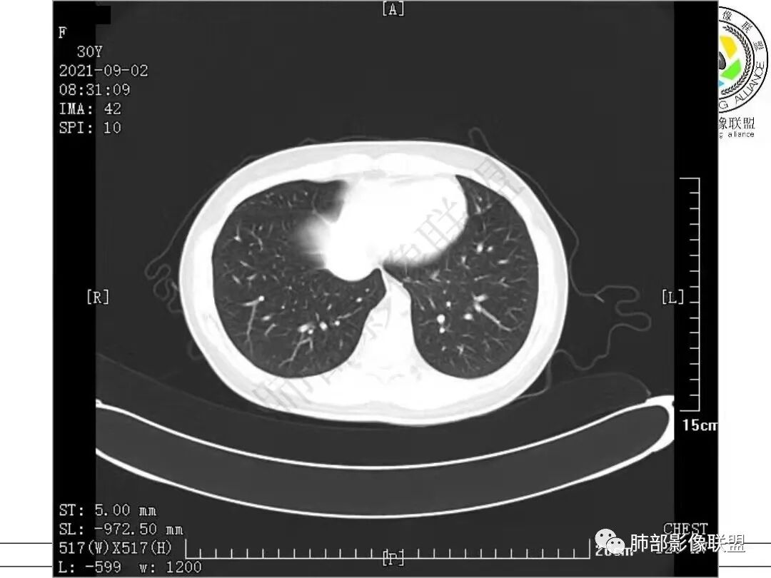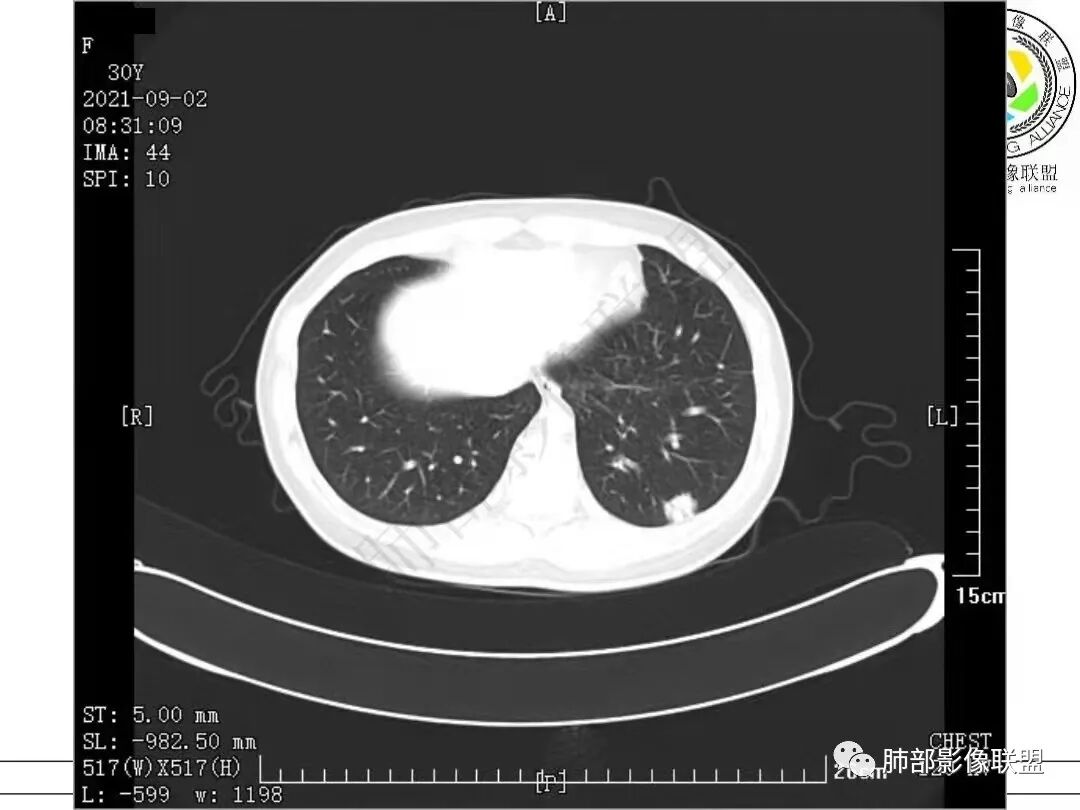 女,30岁,胸膜下实性结节,边界清,表面凹凸不平、锯齿样,分叶,少许界清GGO,内见空泡、低密度间隙,胸膜糊墙,考虑恶性,腺癌?鉴别PC、TB等慢性肉芽肿性炎。